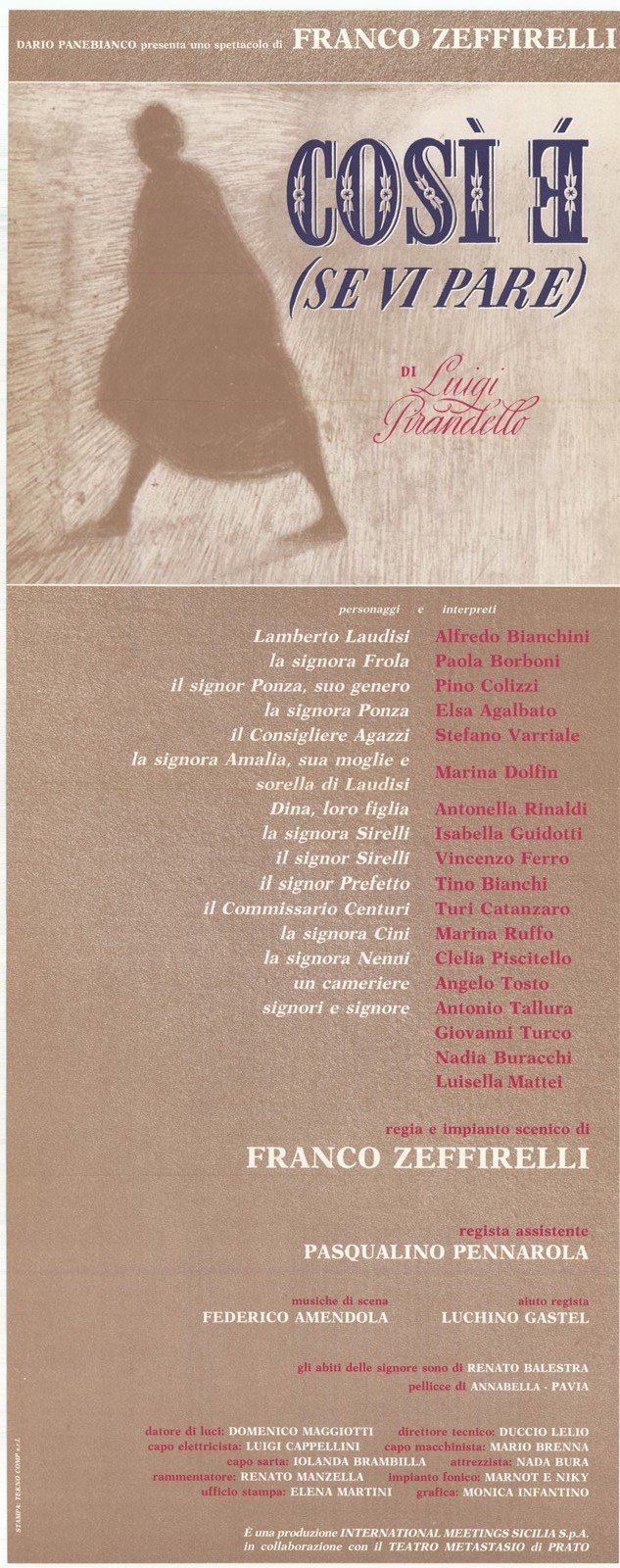 Locandina originale, Dario Panebianco presenta uno spettacolo di Franco Zeffirelli, con Paola Borboni, in collaborazione con il Teatro Metastasio di Prato. Testo al retro. Pieghe