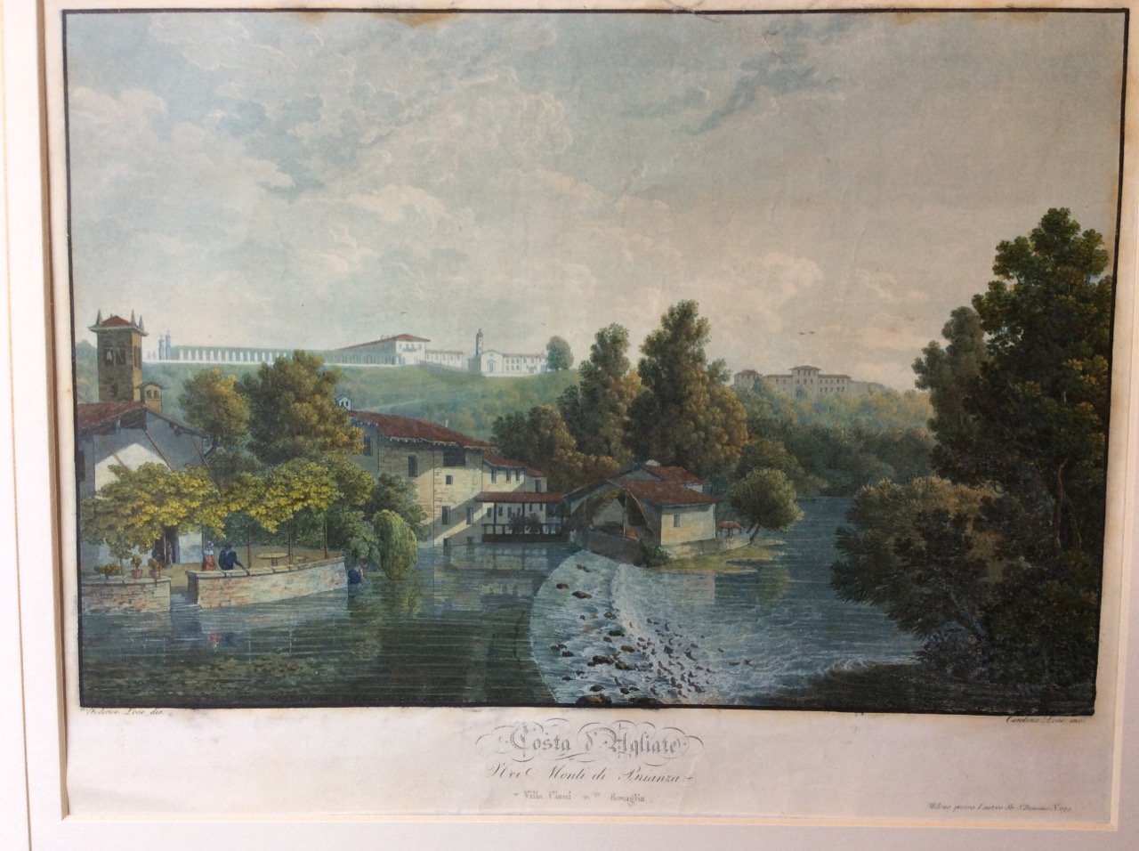Bella veduta incisa all'acquatinta, stampata a colori e ritoccata a mano (mm. 204x300, più grandi margini), disegnata da Federico Lose ed incisa da Carolina Lose (è sotto passe-partout). Fa parte della magnifica serie 24 migliori vedute pittoresche nei monti della Brianza.Villa Ciani-Rovaglia, in alto sul poggio, a dominare il singolare paesaggio della costa di Agliate, una delle prime, brevi, ondulazioni del terreno dopo la pianura. Sotto ecco il Lambro.. Tra tutti i disegni, sempre suggestivi, di Federico Lose, questo, dedicato alla Costa d'Agliate, riunisce in sé tutti i caratteri descrittivi del paesaggio brianteo. C'è la grande villa patrizia, sul colle, un campanile aguzzo, c'è il verde diffuso nel bosco e nel sottobosco, c'è l'acqua che appare come elemento indispensabile nel quadro composito e vario del paesaggio brianteo. Così Rodi Omaggio alla Brianza, p. 54.Esemplare ben conservato.