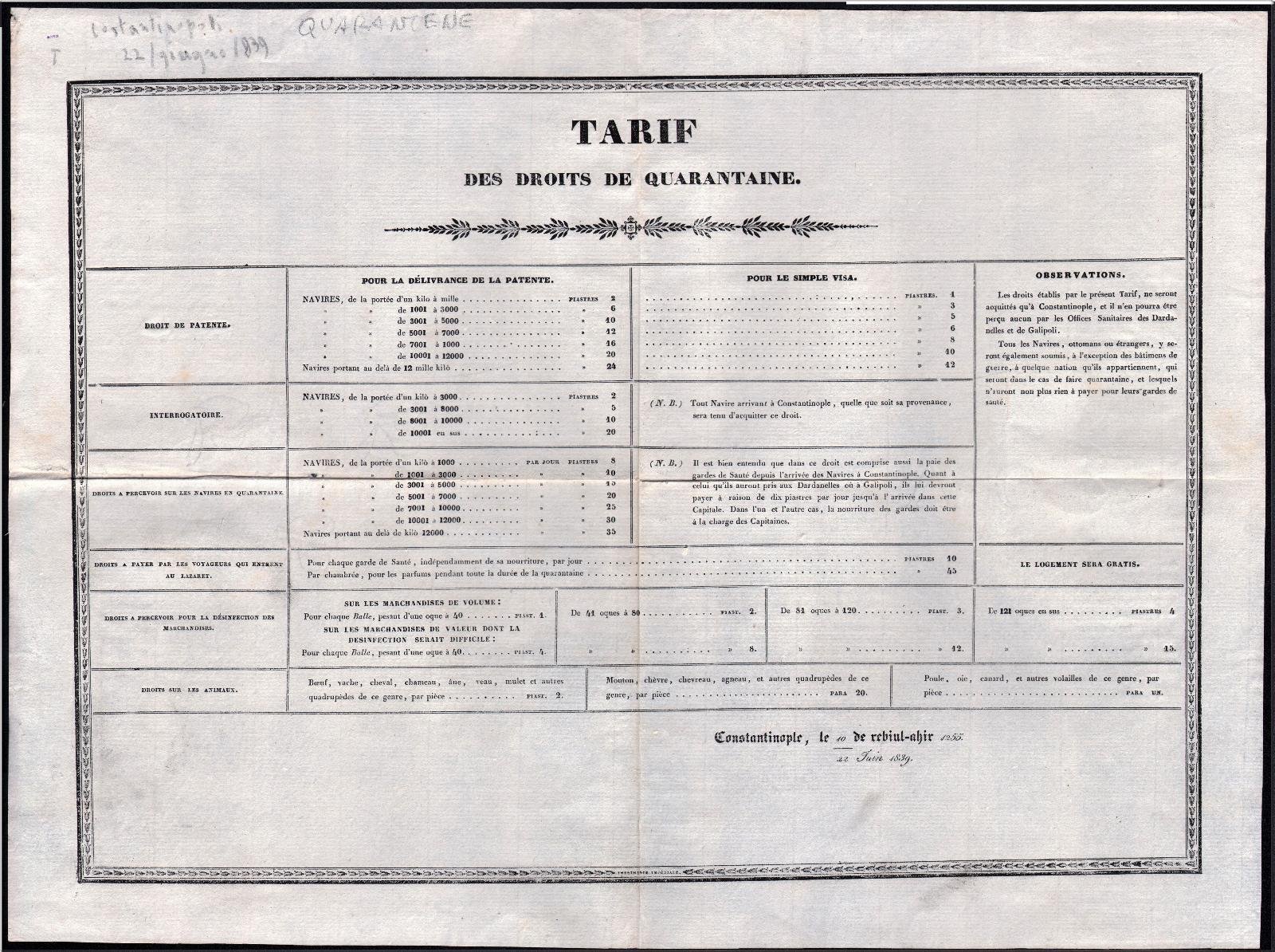 Tarif des Droits de Quarantene Costantinople 22 Iuin 1839