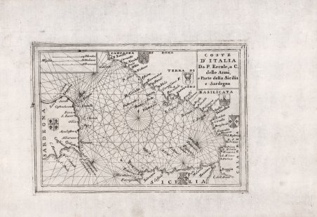 Piccola carta nautica del Tirreno meridionale che comprende le coste a sud di Porto Ercole fino a Capo delle Armi ed include la parte settentrionale della Sicilia e quella orientale della Sardegna. Dal punto di vista cartografico sembra essere una riduzione dell’opera di Francesco Maria Levanto, pubblicata nella Prima Parte dello Specchio del Mare (Genova, 1664) del quale Coronelli acquisisce le lastre e ristampa. Tavola tratta dal rarissimo ' Teatro della Guerra diviso in XXXXVIII parti ' del Coronelli edito a Venezia (sebbene nel frontespizio sia indicato Napoli) tra il 1706 ed il 1709. La raccolta comprende centinaia di vedute, carte geografiche e nautiche di tutte le parti del mondo. Come scrive Ermanno Armao, grande studioso del Coronelli, "non è facile stabilire quanti e quali sono i volumi che compongono la raccolta". Secondo Augusto De Ferrari (cfr. Dizionario Biografico degli Italiani - Volume 29, 1983): “il ' Teatro della guerra ' era previsto in quarantotto volumi, ma ne uscirono solo ventisette a Venezia tra il 1706 e il 1709, anche se recano diverse indicazioni, ed intendeva essere una descrizione geografica degli Stati coinvolti nella guerra di successione spagnola, con poche pagine di testo e molte tavole (circa duemila), non tutte originali”. ' Alcune carte derivano da quelle già incluse nel testo dell'Isolario ' del 1696, con alcune varianti – spesso nella dedica. La maggior parte delle vedute viene tuttavia realizzata appositamente per l'opera. Acquaforte, in perfetto stato di conservazione. Rara. Small nautical chart of the southern Tyrrhenian Sea that includes the coast south of Porto Ercole to Capo delle Armi and includes the northern part of Sicily and the eastern part of Sardinia. Cartographically it appears to be a reduction of Francesco Maria Levanto's work, published in the Prima Parte dello Specchio del Mare (Genoa, 1664) of which Coronelli acquired the plates and reprinted. Plate taken from the rare ' Teatro della Guerra diviso in XXXXVIII parti ' by Coronelli published in Venice (although the title page is indicated Naples) between 1706 and 1709. The collection includes hundreds of views, maps and nautical charts of all parts of the world. As Ermanno Armao, a great scholar of Coronelli, writes, it is not easy to establish how many and which are the volumes that make up the collection. According to Augusto De Ferrari (cf. Dizionario Biografico degli Italiani - Volume 29, 1983) the ' Teatro della Guerra diviso in XXXXVIII parti ' was planned in forty-eight volumes, but only twenty-seven were published in Venice between 1706 and 1709, even if they bear different indications, and was intended to be a geographical description of the States involved in the War of the Spanish Succession, with few pages of text and many plates (about two thousand), not all of them original". Some maps derive from those already included in the text of the ' Isolario ' of 1696, with some variations - often in the dedication. Most of the views, however, are made specifically for the work. Copper engraving, in perfect condition. Cfr.