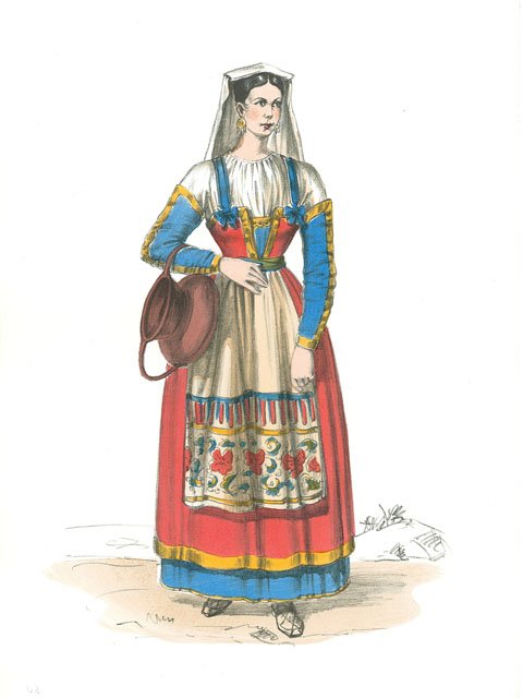 Costume caratteristico del luogo, disegnato, stampato e colorato a mano dal pittore Aldo Fornoni coadiuvato dalla pittrice Maria Angela Grassi