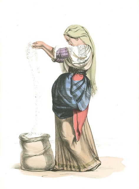 Costume caratteristico del luogo, disegnato, stampato e colorato a mano dal pittore Aldo Fornoni coadiuvato dalla pittrice Maria Angela Grassi