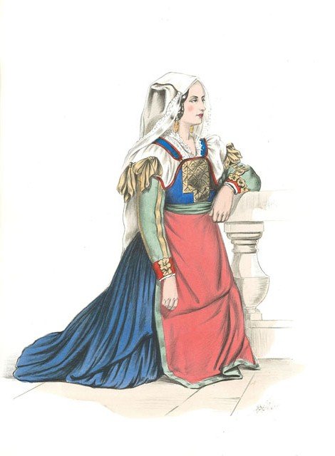 Costume caratteristico del luogo, disegnato, stampato e colorato a mano dal pittore Aldo Fornoni coadiuvato dalla pittrice Maria Angela Grassi