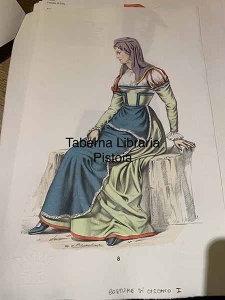 Litografia originale in splendida acquerellatura coeva tratta da Costumi popolari italiani, Milano, Gorlich Editore, 1950 ca. Le dimensioni sono mm. 350x250 al margine.Il disegno Ë stato eseguito dal pittore Aldo Fornoni e stampato su bella carta con Filagrana Enrico Magnani di Pescia. Litografia di notevole importanza perchÈ veritiera (riprese direttamente dagli es. d'epoca del Museo della Scala di Milano) e molto curata nei particolari. Stampa in ottima conservazione, molto fine e assai decorativa, dai colori splendidi e con tiratura in soli 500 es.