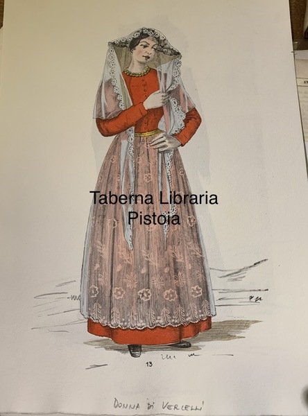 Litografia originale in splendida acquerellatura coeva tratta da Costumi popolari italiani, Milano, Gorlich Editore, 1950 ca. Le dimensioni sono mm. 350x250 al margine.Il disegno Ë stato eseguito dal pittore Aldo Fornoni e stampato su bella carta con Filagrana Enrico Magnani di Pescia. Litografia di notevole importanza perchÈ veritiera (riprese direttamente dagli es. d'epoca del Museo della Scala di Milano) e molto curata nei particolari. Stampa in ottima conservazione, molto fine e assai decorativa, dai colori splendidi e con tiratura in soli 500 es.