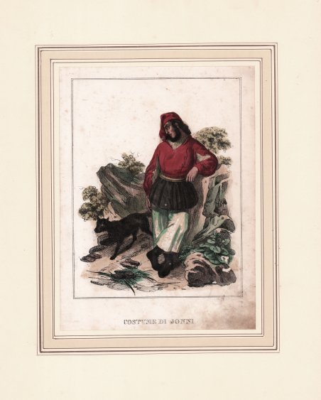 Costume popolare tratto dal celebre ' Cenni sulla Sardegna illustrati da 60 litografie in colore di B.L. Torino 1841. La raccolta, stampata dalla Stamperia Botta di Torino, contiene 60 scene di costume popolare e una carta dell’isola in litografia, finemente colorate a mano. Una seconda edizione dell’opera, con solo 26 tavole di costumi, venne ristampata nel 1843, sempre a Torino. Il raro volume di Baldassarre Luciano (1806-1863) è considerato una tra le più significative opere iconografiche sulla Sardegna. Essa si articola in 16 capitoli, impreziositi da tavole fuori testo a colori che raffigurano prevalentemente i costumi tradizionali di numerose località dell’isola. Il volume è il resoconto di un viaggio compiuto nelle province sarde, indubbiamente ispirato alle pubblicazioni di illustri viaggiatori dell’epoca. Nelle conclusioni del libro, infatti, l’autore, con il chiaro intento di mettere fine a dicerie sul suo lavoro, dichiara che "dai libri della Marmora, del Manno, di Mimaut, di Valery e del P. Ciotti furono tratte le materie componenti i presenti cenni, non che da privati carteggi e da nozioni particolari somministrate da personaggi degni di fede". Seppur poco stimata per la poca originalità dei testi e per la discutibile fedeltà delle illustrazioni, il libro di Baldassarre Luciano è ritenuto la più bella opera, sotto il prospetto iconografico, dell'intera letteratura sulla Sardegna ed ha il merito di essere la prima copiosamente illustrata edita in Italia. Molte tavole furono disegnate da Lorenzo Pedroni, uno dei pionieri della litografia in Piemonte. Coloritura coeva, ossidazioni diffuse, per il resto in buono stato di conservazione. Rara. Bibliografia Piloni, n. 60-121. Per un esemplare completo https://www.sardegnadigitallibrary.it/index.php?xsl=626&id=220553 Costume popolare tratto dal celebre ' Cenni sulla Sardegna illustrati da 60 litografie in colore di B.L. Torino 1841. La raccolta, stampata dalla Stamperia Botta di Torino, contiene 60 scene di costume popolare e una carta dell’isola in litografia, finemente colorate a mano. Una seconda edizione dell’opera, con solo 26 tavole di costumi, venne ristampata nel 1843, sempre a Torino. Il raro volume di Baldassarre Luciano (1806-1863) è considerato una tra le più significative opere iconografiche sulla Sardegna. Essa si articola in 16 capitoli, impreziositi da tavole fuori testo a colori che raffigurano prevalentemente i costumi tradizionali di numerose località dell’isola. Il volume è il resoconto di un viaggio compiuto nelle province sarde, indubbiamente ispirato alle pubblicazioni di illustri viaggiatori dell’epoca. Nelle conclusioni del libro, infatti, l’autore, con il chiaro intento di mettere fine a dicerie sul suo lavoro, dichiara che "dai libri della Marmora, del Manno, di Mimaut, di Valery e del P. Ciotti furono tratte le materie componenti i presenti cenni, non che da privati carteggi e da nozioni particolari somministrate da personaggi degni di fede". Seppur poco stimata per la poca originalità dei testi e per la discutibile fedeltà delle illustrazioni, il libro di Baldassarre Luciano è ritenuto la più bella opera, sotto il prospetto iconografico, dell'intera letteratura sulla Sardegna ed ha il merito di essere la prima copiosamente illustrata edita in Italia. Molte tavole furono disegnate da Lorenzo Pedroni, uno dei pionieri della litografia in Piemonte. Coloritura coeva, ossidazioni diffuse, per il resto in buono stato di conservazione. Rara. Bibliografia Piloni, n. 60-121. Per un esemplare completo https://www.sardegnadigitallibrary.it/index.php?xsl=626&id=220553 Cfr.