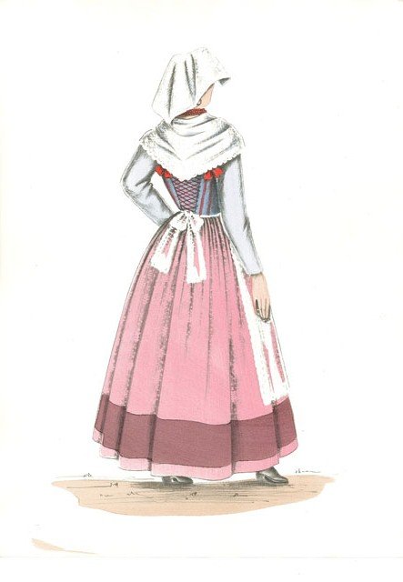 Costume caratteristico del luogo, disegnato, stampato e colorato a mano dal pittore Aldo Fornoni coadiuvato dalla pittrice Maria Angela Grassi