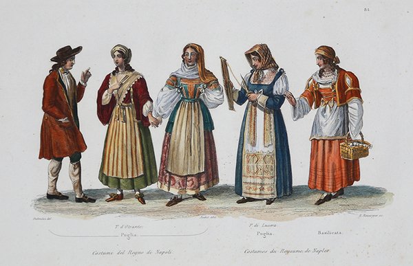 Costumi popolari pugliesi e lucani; tavola tratta dal celebre L'Italie, la Sicile, les Iles Éoliennes, l'Ile d'Elbe, la Sardaigne, Malte, l'Ile de Calypso etc. D'après les inspirations, les recherches et les travaux de M. M. le Vicomte de Chateaubriand, De Lamartine, Raoul-Rochette, le Comte de Forbin, Piranesi, Mazzara, et de Napoléon, Denon, Saint-Non, Lord Byron, Goethe, Visconti, Cicognara, Lanzi, de Bonstetten, Swinburne, etc. Sites, Monumens, Scènes et Costumes, d'après M.me Haudebourt-Lescot, MM. Horace-Vernet, Granet, Isabey, Ciceri, Mazzara, le Major Light, le Cap. Batty, Cooke, Gell et Gandy, Pinelli, Ferrari, Zucoli, et beaucoup d'autres artistes italiens. Recueillis et publiés par Audot Père, Membre de la Société de Géographie, edito a Parigi tra il 1834 ed il 1837 e ristampato a Torino [Giuseppe Pomba e Ca, 1834-1838]. L'opera, in cinque volumi, raccoglie scritti di autori vari, curati da Audot, ed è riccamente illustrata da 324 incisioni su acciaio fuori testo, molte delle quali con accostamento multiplo, per un totale di 473 tavole. Fu notoriamente mastodontico il lavoro cui si sottopose Louis Eustache Audot (1783-1870). ' Acquaforte, finemente colorata a mano, in ottimo stato di conservazione Plate taken from the famous L'Italie, la Sicile, les Iles Éoliennes, l'Ile d'Elbe, la Sardaigne, Malte, l'Ile de Calypso etc. D'après les inspirations, les recherches et les travaux de M. M. le Vicomte de Chateaubriand, De Lamartine, Raoul-Rochette, le Comte de Forbin, Piranesi, Mazzara, et de Napoléon, Denon, Saint-Non, Lord Byron, Goethe, Visconti, Cicognara, Lanzi, de Bonstetten, Swinburne, etc. Sites, Monumens, Scènes et Costumes, d'après M.me Haudebourt-Lescot, MM. Horace-Vernet, Granet, Isabey, Ciceri, Mazzara, le Major Light, le Capt. Batty, Cooke, Gell et Gandy, Pinelli, Ferrari, Zucoli, et beaucoup d'autres artistes italiens. Recueillis et publiés par Audot Père, Membre de la Société de Géographie, published in Paris between 1834 and 1837 and reprinted in Turin [Giuseppe Pomba e Ca, 1834-1838]. The work, in five volumes, collects the writings of various authors, edited by Audot, and is richly illustrated with 324 engravings on steel outside the text, many of them with multiple combinations, for a total of 473 tables. Louis Eustache Audot (1783-1870) was a notoriously mammoth task. ' Finely hand-colored. Cfr.