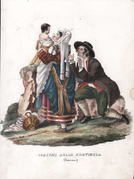 Scena di costume popolare tratta dall’Atlante Corografico, Statistico, Storico, ed Idrografico del Regno delle Due Sicilie Diviso ne Domini al di qua ed al di la del Faro ' di Giuseppe Bifezzi, stampato a Napoli, Tipografia alla Sibilla, 1836-1845. L'opera uscì a Napoli tra il 1836 e il 1845 in 15 dispense, ciascuna composta di testo e tavole ed è assai rara. Il progetto prevedeva anche una seconda parte riguardante la Sicilia che non fu mai realizzata. Le 15 dispense, ciascuna con frontespizio proprio, riguardano: I. ' Provincia di Napoli, 1843. II. ' Provincia di Terra di lavoro, 1841. III. ' Provincia di Principato citeriore, 1841. IV. ' Basilicata,1843. V. ' Principato ulteriore,1836. VI. ' Capitanata, 1842. VII. ' Terra di Bari, 1839. VIII. ' Terra di Otranto, 1841. IX. ' Calabria citeriore, 1836. X. ' Calabria ulteriore II, 1839. XI. ' Calabria ulteriore I, 1839. XII. ' Contado di Molise, 1842. XIII. ' Abruzzo citeriore, 1837. XIV. ' Abruzzo ultra secondo, ' 1838. XV. ' Abruzzo ulteriore primo, 1841. Il volume è illustrato da una carta geografica generale del Regno di Napoli, 2 tavole con raffigurati i laghi principali del Regno, 15 carte geografiche con i confini acquerellati, corrispondenti alle 15 province, 16 vedute: Napoli, Caserta, Capua, Salerno, Potenza, Avellino, Foggia, Bari, Lecce, Cosenza, Catanzaro, Reggio Calabria, Campobasso, Chieti, Aquila, Teramo e 16 tavole di costumi delle diverse province. Le vedute e i costumi sono litografie di Giuseppe D’Onofrio da disegni di Francesco Wenzel. Franz Wenzel, meglio conosciuto con il nome italianizzato di Francesco, è un litografo attivo a Napoli tra il 1827 e il 1850 con sede a Largo S. Caterina a Chiaja n.74 e 75. Wenzel appartiene al gruppo di artisti tedeschi a Napoli dalla prima metà dell'800, dove si generalizza l'uso della tecnica di stampa di importazione tedesca, la litografia. Nel 1816 Müller e Patrelli introducono nel Regno la più economica e rapida litografia e nel 1823 nasce la Litografia Militare. Dopo gli esordi introduttivi, crescono stabilimenti litografici già attivi negli anni '25-'30 (Cuciniello/Bianchi, Richter, Wenzel, Zezon), impiantandosi nella seconda metà del secolo varie imprese tipo-litografiche (Nobile, Giannini, Morano). Litografia con bellissima coloritura a mano, in ottimo stato di conservazione. Popolar costume scene from the ' Atlante Corografico, Statistico, Storico, ed Idrografico del Regno delle Due Sicilie Diviso ne Domini al di qua ed al di la del Faro ' by Giuseppe Bifezzi, printed in Naples, Tipografia alla Sibilla, 1836-1845. This is the definitive edition of Calabrian geographer Giuseppe Bifezzi's important survey of the peninsular part of the Kingdom of Naples. The work came out in Naples between 1836 and 1845 in 15 parts, each consisting of text and plates, and is very rare. The project also included a second part concerning Sicily, which was never realized. The volume is illustrated by a general map of the Kingdom of Naples, 2 plates depicting the main lakes of the Kingdom, 15 maps with watercolor borders, corresponding to the 15 provinces, 16 views: Naples, Caserta, Capua, Salerno, Potenza, Avellino, Foggia, Bari, Lecce, Cosenza, Catanzaro, Reggio Calabria, Campobasso, Chieti, Aquila, Teramo, and 16 plates of costumes of the different provinces. The views and costumes are lithographs by Giuseppe D'Onofrio from drawings by Francesco Wenzel. Franz Wenzel, better known by his Italianized name of Francesco, was a lithographer active in Naples between 1827 and 1850 based at Largo S. Caterina a Chiaja n.74 and 75. Wenzel belongs to the group of German artists in Naples from the first half of the 19th century, where the use of the German imported printing technique, lithography, became generalized. In 1816 Müller and Patrelli introduced the cheaper and faster lithography to the Kingdom, and in 1823 Military Lithography was born. After the introductory beginnings, lithographic establishments already active in the 1825s-30s grew (Cuciniello/Bianchi, Richter, Wenzel, Zezon), implanting in the second half of the century various lithographic-type enterprises (Nobile, Giannini, Morano). Litograph, with fine later hand colour, very good condition. Cfr.