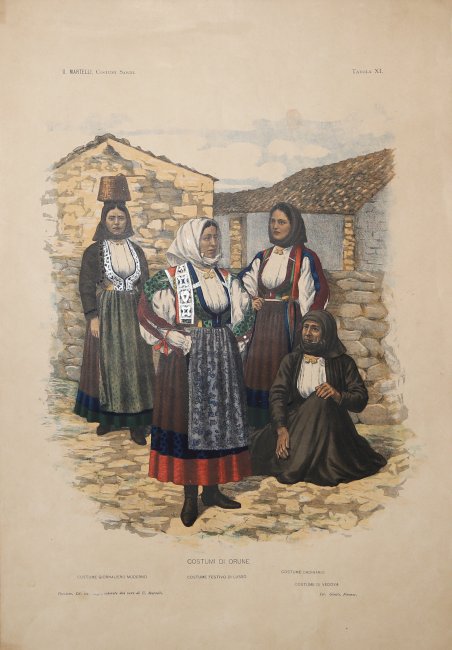 Litografia a colori curata da Valentino Martelli nel 1899, disegnata dal Guerrini e stampate a Firenze presso la stamperia Litografia Giusti. Il costume appartiene ad una serie di 13 tavole in litografia a colori opera di Puccioni (6) e di Guerrini (7) colorate dal vero dal Martelli. Si tratta di una raccolta particolarmente significativa per quanto riguarda l'antropologia sarda, pubblicata in cartella, negli stessi anni di altre opere analoghe come quella di Enrico Costa. In buono stato di conservazione. Litografia a colori curata da Valentino Martelli nel 1899, disegnata dal Guerrini e stampate a Firenze presso la stamperia Litografia Giusti. Il costume appartiene ad una serie di 13 tavole in litografia a colori opera di Puccioni (6) e di Guerrini (7) colorate dal vero dal Martelli. Si tratta di una raccolta particolarmente significativa per quanto riguarda l'antropologia sarda, pubblicata in cartella, negli stessi anni di altre opere analoghe come quella di Enrico Costa. In buono stato di conservazione. Cfr.