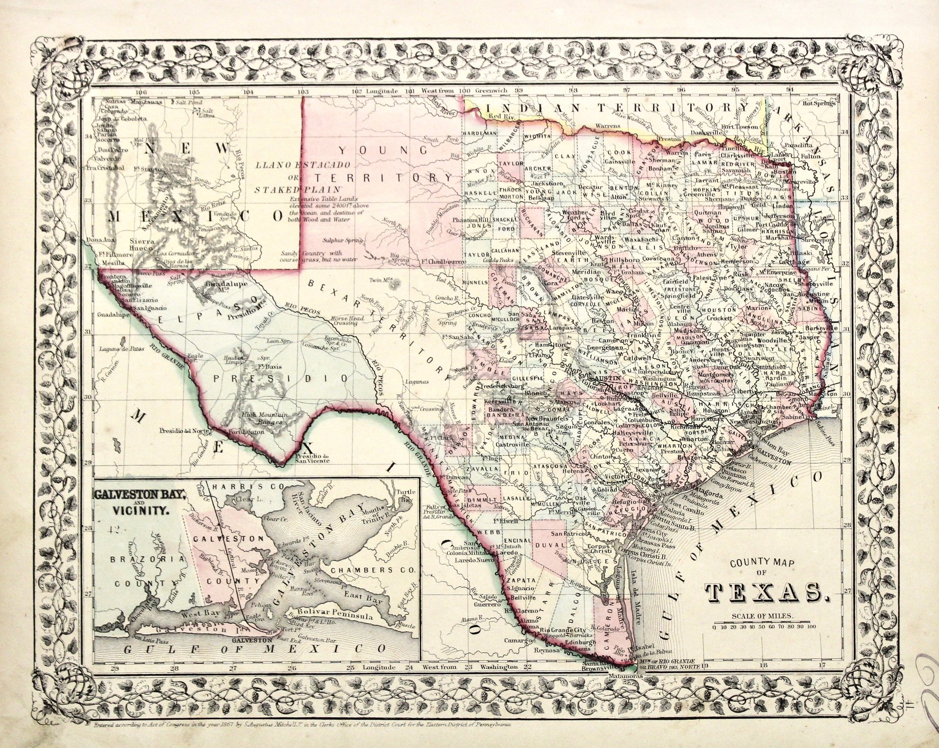Incisione in acciaio, dipinta d'epoca a tutto campo, mm 270x340. Carta del territorio con riquadro che raffigura la baia di Galveston, tutto inquadrato entro bordura decorativa con vitigno intrecciato. Bell'esemplare ben conservata, minimi lievi macchie marginali.