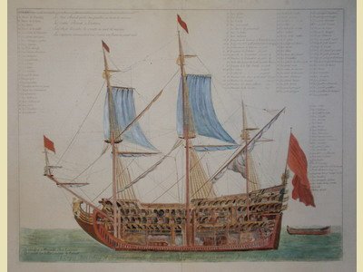 Coupe dun Amiral de 104 pieces de canon avec ses principales proportions et les noms des pieces du deilans.