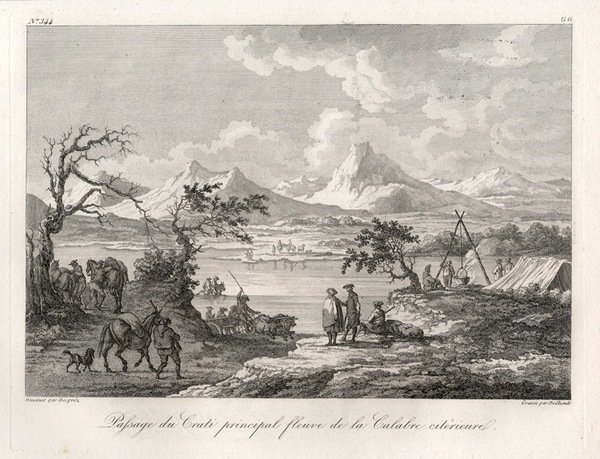 CRATI - "Passage du Crati principal fleuve de la Calabre citérieure". Suggestiva veduta panoramica con mare e personaggi in primo piano.