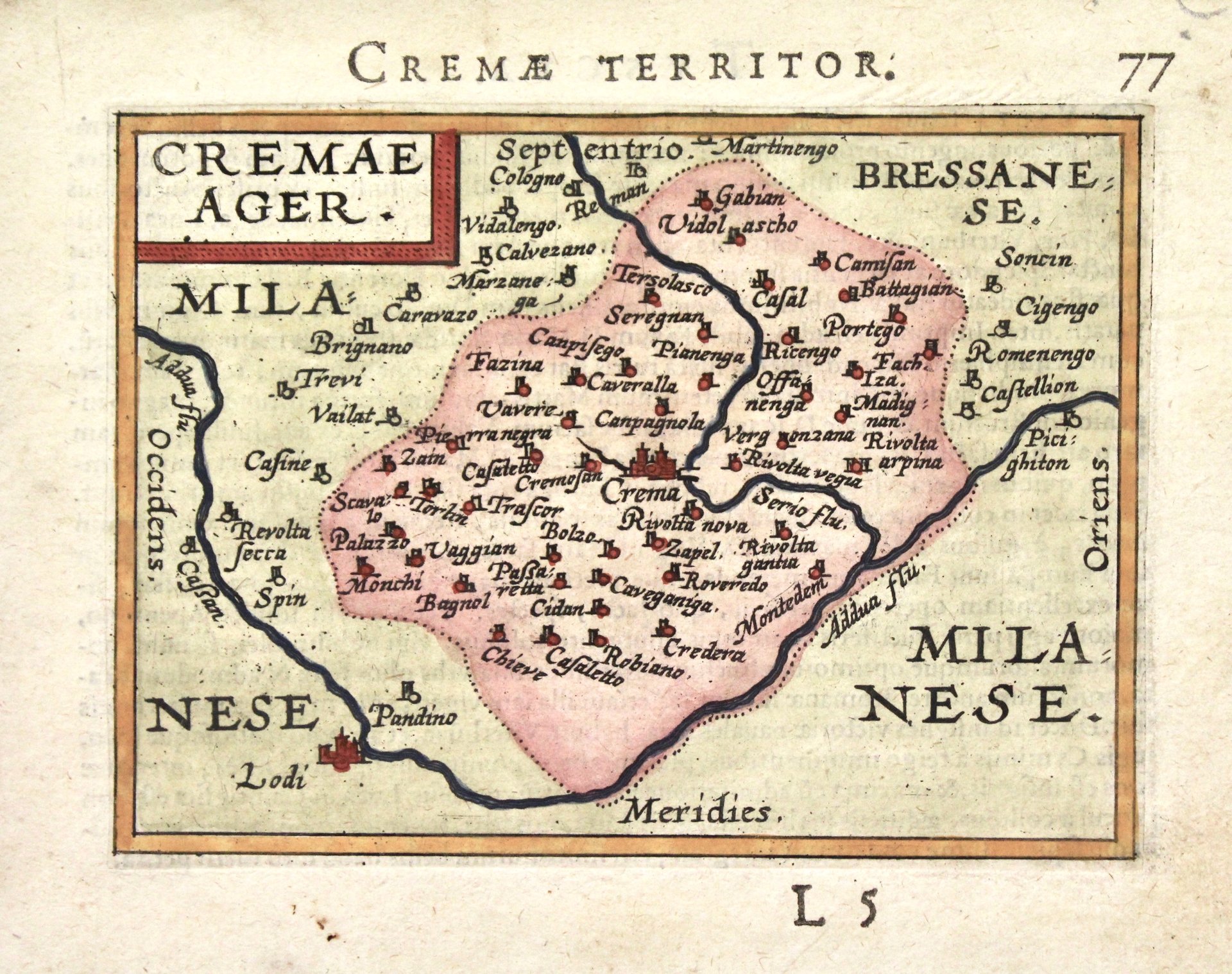 Incisione in rame, fascinosa coloritura posteriore, mm 80x110. Piacevole carta in miniatura tratta da "Epitome du Theatre du monde" una edizione tascabile del "Theatrum Orbis Terrarum" il primo atlante moderno, comprendente carte di tutte le zone del mondo; la geniale intuizione di Ortels, latinizzato successivamente in Ortelius, fu appunto questa: prima d'allora la produzione cartografica era stata irregolare, locale a livello di produzione ed i pochi atlanti, i cosiddetti "Atlanti Lafreriani" erano costituiti su richiesta raccogliendo solo carte di alcune zone. Ortelius riunì in un unico corpus la produzione cartografica eterogenea del periodo, costituendo la base per un'impresa editoriale di enorme successo, pubblicata tra il 1570 e il 1612. Buon esemplare stampato piuttosto decentrato in alto nel foglio, tracce di sporco superficiali.