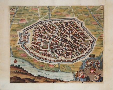 Pianta di Cremona ' tratta dal “Thesaurus Antiquitatum et Historiarum Italiae, Neapolis, Siciliae Sardiniaae, Corsicae e Melitae”, monumentale opera di Georgius Graevius pubblicata nel primo quarto del XVIII secolo. Tra il 1704 e il 1725 sono stampati a Leida i 45 volumi del "Thesaurus antiquitatum", generazione complessa, laboriosa, esaltata da alcuni come straordinaria, criticata, invece, da altri, che ne parlarono come di una "compilation énorme sans choix e sans ordre ". Un progetto che ha riguardato molto i contemporanei, in Italia, ma che ha interessato poco storiografia dopo che, tranne rari casi, ne ha sottolineato il carattere meramente erudito e la sostanziale inutilità. L'opera di Graevius è tuttavia arricchita dalle preziose tavole firmate dall'editore olandese Pieter Vander AA. Pieter van der Aa era già nel 1682 proprietario di una libreria e di una casa d'aste. Nel corso della sua vita ha pubblicato un'enorme quantità di materiale stampato. Dopo il 1700, van der Aa si specializzò sempre più in libri di geografia e di viaggio. Pubblicò atlanti compositi, una serie di descrizioni geografiche dei Paesi europei e alcune opere molto spettacolari. Tra il 1706 e il 1708 pubblicò il Naauweurige versameling der gedenkwaardigste zee- en land-reysen, in 28 volumi. Molte delle pubblicazioni di Van der Aa sono riccamente illustrate con mappe e tavole. Egli rilevò molte tavole e stampe in rame da altri editori come Carel Allard e Frederik De Wit. Gli atlanti compositi che uscirono dal suo laboratorio contengono una curiosa miscela di materiale proprio, copie di mappe di altri editori e ristampe di vecchie lastre di rame, ora con la sua firma. La Galérie agréable du monde, completata nel 1729, comprendeva 66 parti, rilegate in 27 volumi. Van der Aa la presentò come un buon investimento; dopo la pubblicazione, il valore antiquario dell'opera sarebbe raddoppiato, tanto più che fu stampata in un'edizione limitata a soli cento esemplari. Acquaforte, finemente colorata a mano, in ottimo stato di conservazione. Map taken from "Thesaurus Antiquitatum et Historiarum Italiae, Neapolis, Siciliae Sardiniaae, Corsicae and Melitae," a monumental work by Georgius Graevius published in the first quarter of the 18th century. Between 1704 and 1725, the 45 volumes of the "Thesaurus antiquitatum" were printed in Leiden, a complex, laborious generation, extolled by some as extraordinary, criticized, on the other hand, by others, who spoke of it as a "compilation énorme sans choix e sans ordre". A project that concerned contemporaries a great deal, in Italy, but interested little historiography afterwards, which, except in rare cases, emphasized its merely scholarly character and substantial uselessness. However, Graevius' work is enriched by the valuable plates signed by Dutch publisher Pieter Vander AA. Pieter van der Aa was by 1682 the owner of a bookstore and auction house. During his lifetime he published an enormous amount of printed material. After 1700, van der Aa specialized more and more in geography and travel books. He published composite atlases, a series of geographical descriptions of European countries, and some very spectacular works. Between 1706 and 1708 he published Naauweurige versameling der gedenkwaardigste zee- en land-reysen, in 28 volumes. Many of Van der Aa's publications are richly illustrated with maps and plates. He took over many copperplates and prints from other publishers such as Carel Allard and Frederik De Wit. The composite atlases that came out of his workshop contain a curious mixture of his own material, copies of maps from other publishers, and reprints of old copper plates, now bearing his signature. The Galérie agréable du monde, completed in 1729, comprised 66 parts, bound in 27 volumes. Van der Aa presented it as a good investment; after publication, the work's antiquarian value would double, especially since it was printed in a limited edition of only one hundred examples. Etching, finely hand-colored, in excellent condition. ' Cfr.