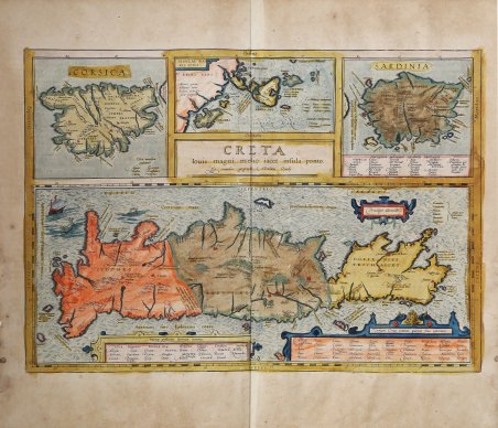 Splendida carta storico-geografica pubblicata nel ' Parergon ' di Abraham Ortelius. Questa tavola rappresenta, diversamente orientate ad Est o a Nord, Creta e altre isole dello Ionio (Corfù, Itaca, Zante, Lefkada), la Sardegna e la Corsica, ciascuna con margine graduato, longitudine e latitudine, inserite in riquadri in cui è riportato anche un elenco di luoghi dalla posizione sconosciuta. Il retro del foglio, riporta la descrizione delle isole rappresentate. Esemplare dalla rara edizione italiana del Theatrum Orbis Terrarum stampata ad Anversa da Jean Baptiste Vrients nel 1608 e quindi nel 1612. Un seconod stato della lastra con alcuni toponimi aggiunti. Quattro mappe incise su una sola lastra. Per la carta di Creta: CRETA | Iovis magni, medio iacet insula ponto. | Ex conatibus geographicis Abrahami Ortelij". [L'isola di Creta, appartenente al grande Giove, che si trova in mezzo al mare, dagli sforzi geografici di Abraham Ortelius], Ortelius cita come fonte contemporanea Francesco Superanti (Soranzo), e come fonti classiche Strabone, Ateneo, Diodoro Siculo ed Eraclide. Per la carta della Corsica Ortelius cita come fonti classiche Ateneo, Eustasio, Marziano Capella, Diodoro Siculo, Strabone, Seneca e Livio. La carta delle isole ioniche: INSVLAE MA:|RI IONII. In alto al centro: ITHACA INS. | "in qua Neritus mons. | Aretusa fons, et Coracis petra". [L'isola di Itaca con il monte Neritus, la sorgente di Aretusa e le rocce di Coracis]. In alto al centro: ZACYNTHVS | INS. "in qua | Elatus mons". [L'isola di Zacinto con il monte Elato]. Ortelius cita come fonti classiche Strabone, Palenses, Athenæus, Livius e Plinius. Per la Sardegna Ortelius cita come fonti classiche Eustathius, Pausanias, Polybius, Strabo, Prudentius, Salvanius, Sidonius, Pomponius, Dioscorides, Plinius e Claudiamus. Circa una decade dopo la pubblicazione del “moderno” Theatrum Orbis Terrarum, Ortelius rispose alle “preghiere di amici e studiosi di storia antica, sacra e profana” e compilò una serie di mappe di soggetto biblico e classico, quasi tutte disegnate da lui. Intitolò l’opera “Parergon theatri”, ovvero “aggiunta, appendice, del Theatrum”, ma al tempo stesso anche complementare al Theatrum: il Paregon theatri forniva per il mondo antico lo stesso materiale che Ortelius aveva fornito per il mondo moderno con il Theatrum: carte geografiche. Lo spirito del Parergon è tutto riassunto nel motto historiae oculus geographia riportato sul frontespizio: la geografia è l’occhio della storia. Le mappe del mondo antico avevano lo scopo di “rendere più chiari gli storici antichi e i poeti”. Le mappe del Paregon sono di tre tipologie: antiche regioni; carte letterarie e carte bibliche. Come sottolinea Koeman “il Parergon deve essere considerato come lavoro personale di Ortelius. Per quest'opera, infatti, diversamente dal Theatrum, non copiò le mappe di altri cartografi, ma ne disegnò lui stesso di nuove ed originali. Riprese luoghi, regioni e territori delle civiltà classiche illustrandone e spiegandone la storia, una materia molto vicina al suo cuore. Le mappe e le lastre del Parergon devono essere valutate come le più importanti incisioni che rappresentano il diffuso interesse per la geografia classica nel XVI secolo”. “La carta vede la raffigurazione delle isole di Creta, Corsica, Sardegna e quelle del mar Ionio. Quella di Creta è completata da due cartigli in cui sono rispettivamente indicati i nomi di luoghi la cui posizione è incerta, ed il secondo con elenco delle città quarum situs ignoratur. "Ella tien il quarto luogo infra l'isole maggiori del Mediterraneo mare." (p. xxxj) e Plinio, citando Dosiade, autore piuttosto oscuro di una storia locale dedicata a Creta, dice abbia preso il nome dalla ninfa Crete. "Quantunque molte sia le cose, che rendan chiara quest'isola & famosa, come l'andata d'Europa.la fierezza del Minotauro & l'aventura; il Labirinto di Dedalo & la fuga.niente tutt. Splendid historical map of the ancient Crete, published in Abraham Ortelius' Parergon. This plate depicts, oriented differently to the east or north, Crete and other Ionian islands (Corfu, Ithaca, Zakynthos, Lefkada), Sardinia and Corsica, each with graduated margin, longitude and latitude, placed in boxes in which a list of places of unknown location is also given. The back of the sheet gives descriptions of the islands depicted. Example from the rare Italian edition of Theatrum Orbis Terrarum printed in Antwerp by Jean Baptiste Vrients in 1608 and then in 1612. A second state of the plate with some place names added. Plate size: 342 x 491 mm. Four maps on one plate. For the Crete map: CRETA | Iovis magni, medio iacet insula ponto. | "Ex conatibus geographicis Abrahami Ortelij". [The isle of Creta, belonging to great Iupiter, which lies in the middle of the sea, from the geographical efforts of Abraham Ortelius], Ortelius mentions the contemporary source Francesco Superanti (Soranzo), and as classical sources Strabo, Athenæus, Diodorus Siculus and Heraclides. For the Corsica map Ortelius mentions as his classical sources Athenæus, Eustathius, Martianus Capella, Diodorus Siculus, Strabo, Seneca and Livius. For the Ionian Islands, title: INSVLAE MA:|RI IONII. Middle top: ITHACA INS. | "in qua Neritus mons. | Arethusa fons, et | Coracis petra". [The isle of Ithaca with mount Neritus, the spring of Arethusa and the rocks of Coracis]. Middle top: ZACYNTHVS | INS. "in qua | Elatus mons". [The isle of Zacynthus with mount Elatus]. Ortelius mentions as his classical sources Strabo, Palenses, Athenæus, Livius and Plinius. For the Sardinia Ortelius mentions as his classical sources Eustathius, Pausanias, Polybius, Strabo, Prudentius, Salvanius, Sidonius, Pomponius, Dioscorides, Plinius and Claudiamus The Parergon is the first historical atlas ever published. It was initially conceived by Ortelius as an appendix to his Theatrum Orbis Terrarum but given the considerable success of these historical maps it l