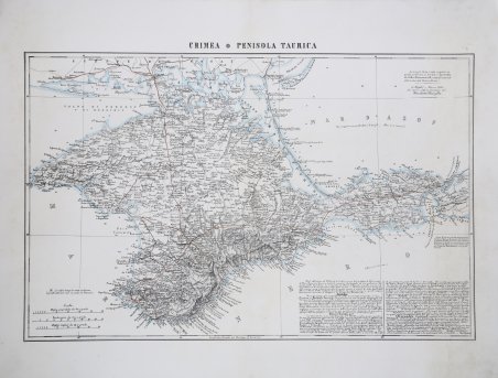 Carta della Crimea al tempo della guerra tra Russia e Turchia, con l’assedio di Sebastopoli. La carta è inserita nell’ ' Atlante geografico. Corredato di notizie relative alla geografia fisica politica, ed in generale alla statistica delle varie regioni del Globo. Compilato ed eseguito in litografia per cura e sotto la direzione di Benedetto Marzolla ' edito a Napoli nel 1856. “Marzolla mostrò una spiccata attenzione anche agi avvenimenti politico-militari internazionali e in particolare alla questione d’oriente ed alla guerra russo-turca, consapevole dell’importanza di quel conflitto per le diplomazie Europee oltre che per gli eserciti e per i nuovi assetti territoriali che si sarebbero creati. Tra il 1854 ed il 1855, egli pubblicò ben cinque carte relative alla Crimea ed una veduta della fortezza di Sebastopoli. Dapprima, stampò una piccola carta della penisola, cui fecero seguito ' La città ed il porto di Sebastopoli ' e una splendida veduta a volo d'uccello della città e della sua insenatura, queste ultime due allegate a un opuscolo di 29 pagine, dal titolo ' Notizie su Sebastopoli ' pubblicato nel settembre del 1854 dalla Tipografia del Re al Ministero dell’Interno. Nel 1855 comparvero, inoltre, una carta con gli ' Accampamenti, trinceramenti, ed operazioni di assedio. nella parte sud di Sebastopoli, ' un ' Piano topografico di Sebastopoli e suoi contorni ' con le posizioni degli eserciti alleati e una carta della ' Crimea o Penisola Taurica ' da servire per il suo ' Atlante Geografico. Nessun altro paese, che non fosse coinvolto direttamente in azioni militari nella guerra Russo-Turca, prestò tanta attenzione come il Regno di Napoli a quell’avvenimento politico e militare, attraverso l’attività informativa di Marzolla, che si interruppe solo allorché Ferdinando II, infastidito dall’intervento vittorioso della coalizione sul fronte di Crimea ordinò che fosse imprigionato chiunque parlasse o scrivesse delle vittorie degli alleati occidentali sui Russi” (cfr. Valerio, ' Benedetto Marzolla Brindisino, Geografo e Cartografo dell’800 Europeo, p. 35). Marzolla, autore di importanti atlanti sulle provincie del Regno di Napoli, è anche autore di diverse carte sulle ' Circoscrizioni Ecclesiastiche nel Regno delle Due Sicilie, pubblicate postume, nello stesso anno della morte (1858) a Napoli nello Stabilimento Geografico diretto da Luigi Manzella. Benedetto Marzolla fu disegnatore topografo e litografo; geografo e cartografo; membro della Commissione di statistica presso il Ministero dell'Interno. Personaggio di grandissimo rilievo nella cartografia napoletana ed italiana del XIX secolo, Marzolla ottenne in vita pubblici riconoscimenti ed attestati per la produzione cartografica di altissima qualità. La sua notorietà si è lentamente dissolta dopo la morte; va tuttavia osservato che solo la mancanza di uno spiccato coinvolgimento politico in senso risorgimentale e di una valenza letteraria nella sua opera non lo hanno reso famoso come i contemporanei Francesco Costantino Marmocchi (1805-1858) e Attilio Zuccagni-Orlandini (1783-1872), con i quali può certamente confrontarsi. I progetti culturali didattici e editoriali di Marzolla furono e rimangono di straordinaria modernità; egli inventò, è il caso di dire, un nuovo modo di intendere e di disegnare la carta geografica, fornendo una visione assolutamente originale della comunicazione dei dati geografici attraverso la combinazione di testo e immagine. Con tale operazione, egli riuscì a fondere in un'unica opera, storia, geografia, economia, statistica e cartografia, raggiungendo un equilibrio grafico di rara efficacia (cfr. V. Valerio, ' Benedetto Marzolla Brindisino, Geografo e Cartografo dell'800 Europeo, Brindisi 2008). Bell’esemplare con coloritura coeva dei contorni, in ottimo stato di conservazione. Bibliografia V. Valerio, ' Benedetto Marzolla Brindisino, Geografo e Cartografo dell’800 Europeo ' (2008). ' Map of Crimea during the the Russo-Turkish war. Map taken from the ' Atlante geografico. ' Corredato di notizie relative alla geografia fisica politica, ed in generale alla statistica delle varie regioni del Globo. Compilato ed eseguito in litografia per cura e sotto la direzione di Benedetto Marzolla ' published in Naples in 1856. “Marzolla showed a marked attention to international politico-military events and in particular to the question of the East and the Russo-Turkish war, aware of the importance of that conflict for European diplomacies as well as for the armies and new territorial arrangements that would be created. Between 1854 and 1855, he published no less than five maps relating to the Crimea and a view of the Sevastopol fortress. First, he printed a small map of the peninsula, which was followed by ' La città ed il porto di Sebastopoli ' and a splendid bird's-eye view of the city and its inlet, the latter two attached to a 29-page pamphlet entitled ' Notizie su Sebastopoli ' published in September 1854 by the Tipografia del Re al Ministero dell’Interno. ' Also appearing in 1855 a map showing the ' Accampamenti, trinceramenti, ed operazioni di assedio. nella parte sud di Sebastopoli, ' the ' Piano topografico di Sebastopoli e suoi contorni ' and a ' Crimea o Penisola Taurica ' to serve for his ' Atlante Geografico. ' No other country, which was not directly involved in military action in the Russo-Turkish War, paid as much attention as the Kingdom of Naples to that political and military event, through Marzolla's information activity, which was interrupted only when Ferdinand II, annoyed by the coalition's victorious intervention on the Crimean front, ordered that anyone who spoke or wrote about the victories of the Western Allies over the Russians be imprisoned” (cfr. Valerio, ' Benedetto Marzolla Brindisino, Geografo e Cartografo dell’800 Europeo, p. 35). Marzolla, author of important atlases on the provinces of the Kingdom of Naples, is also the author of several maps 