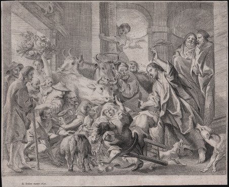 Acquaforte, 1652, firmata nel margine inferior a sinistra: "Iac. Iordaens inuentor. 1652". Primo stato, non descritto dalla bibliografia. La scena illustra la Cacciata dei mercanti dal Tempio: a destra, Cristo si precipita nel Tempio tenendo in alto una corda e rovesciando un tavolo, un uomo è rovesciato dalla sua sedia al centro, l'interno è affollato di persone e animali, due uomini in piedi in una nicchia a destra. Jordaens ha illustrato questo soggetto ripetutamente. Assomiglia molto a un dipinto del Musée du Louvre, Parigi, databile al 1645-50 circa, anche se la composizione della stampa è più semplice e si discosta dalla tela in diversi aspetti. Ci sono sette acqueforti attribuite a Jacob Jordaens (Hollstein 1-3, 5-7 e 9), descritte anche nel catalogo D'Hulst (pp. 132-136). Sebbene tutte indichino Jordaens solo come disegnatore (inventor), sono tradizionalmente considerate anche come incise da lui. Pittore, incisore e disegnatore di arazzi, nativo di Anversa. Lavorò nello studio di Rubens tra il 1637 e il 1638 e divenne il pittore più importante dei Paesi Bassi meridionali dopo la morte di questi, nel 1640. Lavorò anche per il re Carlo I (La storia di Amore e Psiche, intorno al 1640) e la regina Cristina di Svezia (1648); e realizzò diversi dipinti per il municipio di Amsterdam nel 1661. Jordaens era uso firmare i suoi dipinti e la sua corrispondenza olandese con la versione francese del suo nome: 'Jacques Jordaens' (in opposizione all'olandese 'Jacob'). Bellissima prova, impressa su carta vergata coeva, rifilata al rame, restauri perfettamente eseguiti agli angoli inferiori, per il resto in ottimo stato di conservazione. Rara. Bibliografia Hollstein, Dutch and Flemish etchings, engravings and woodcuts c.1450-1700, n. 2; D’'Hulst, Jacob Jordaens (1593-1678). I: Paintings and Tapestries; II: Drawings and Prints, B94. Etching, 1652, lettered in lower margin, at left: "Iac. Iordaens inuentor. 1652". Undescribed early state. Christ driving out the money changers. Christ rushes into the Temple at right holding aloft a rope and overturning a table, a man is knocked from his chair at centre, the interior is crowded with people and animals, two men standing in a niche at right; undescribed early state. Jordaens illustrated this subject repeatedly. It most closely resembles a painting in the Musée du Louvre, Paris, dateable to c.1645-50, though the print's composition is simpler, and diverges from the canvas in several respects. There are seven etchings attributed to Jacob Jordaens (Hollstein 1-3, 5-7 and 9), also described in D'Hulst catalogue (pp.132-136). Although these are all lettered with Jordaens as the designer ('inventor'), they are traditionally considered as also made by him. Jacob Jordaens (1593 – 1678) was a painter, etcher and tapestry designer in Antwerp. Worked in Rubens studio between 1637 and 1638 and became the most important painter in the Southern Netherlands after Rubens' death in 1640. Also employed by King Charles I (The Story of Cupid and Psyche, around 1640) and Queen Christina of Sweden (1648); and he made several paintings for the Town Hall in Amsterdam in 1661. A fine impression, printed on contemporary laid paper, trimmed to the platemark, perfect repairs at the lower corners, otherwise good condition. Rare. Bibliografia Hollstein, Dutch and Flemish etchings, engravings and woodcuts c.1450-1700, n. 2; D’'Hulst, Jacob Jordaens (1593-1678). I: Paintings and Tapestries; II: Drawings and Prints, B94. Cfr.