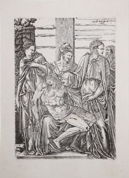Bulino, 1565, datato e firmato in alto a destra 'BAR.BRIX.F / .65'.Bellissima prova, impressa su carta vergata coeva, con margini, in perfetto stato di conservazione.L’opera raffigura l’episodio finale della Passione di Cristo, ovvero la deposizione dalla Croce, secondo il Vangelo di Giovanni, in cui il corpo di Gesù, ormai esanime, viene deposto dalla croce. Il suo corpo è sorretto dalla Vergine, seduta. Alla sua destra è la Maddalena. A sinistra, S. Giovanni Evangelista, Giuseppe di Arimatea e Nicodemo.Splendida impressione di questo stampa estremamente rara.Ex collezione A. C. de Poggi (Lugt 617). Bibliografia Bartsch XV.535.2; Nagler, I, 1684. Engraving, 1565, Lettered in upper right 'BAR.BRIX.F / 1565'. A fine impression, printed on laid paper, with margiins, perfect condition.The lamentation beneath the Cross, Christ is held by the Virgin, to the left is the Magdalene and at the right, St John the Evangelist, St Joseph of Arimathaea and Nicodemus A very good impression of this extremely scarce print.Ex collection A. C. de Poggi (Lugt 617). Bibliografia Bartsch XV.535.2; Nagler, I, 1684. Cfr.