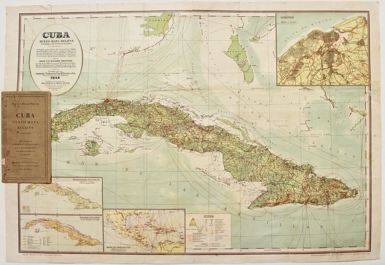 Litografia a colori, mm 460x670, stampata a Zurigo da Orell Füssli per conto dell'editore Libreria Cervantes di R. Veloso y Cia. La carta è basata sulla Nuova Carta Militare della Repubblica (1925) come spiegato nel cartiglio "…trabajado sobre la base de la nueva Carta Militar de la Republica, confecionada por la Secciòn de Ingegnieria del Estado Mayor del Ejercito de Cuba y de acuerdo con las ultimas informaciones e indicaciones de las demas entidades respectivas por el Prof.C.F. Byland-Fritschy ex Jefe de una missione special de Estado en el Perù. Miembro de la Sociedad Geografica de Lima-Perù Miembro de la National Geographic de Washington, USA.". Rara carta che riporta una pianta di L'Avana in alto a destra, oltre a tre riquadri in basso a sinistra con una mappa geologica, una agricola ed una delle rotte nel golfo del Messico.<BR>Ottimo esemplare con custodia editoriale marrone con titolo a stampa, traccia di pieghe editoriali, angoli nelle pieghe con difetti e piccole mancanze, due lunghi strappi lungo le pieghe restaurati con applicazione di striscia cartacea.<BR>