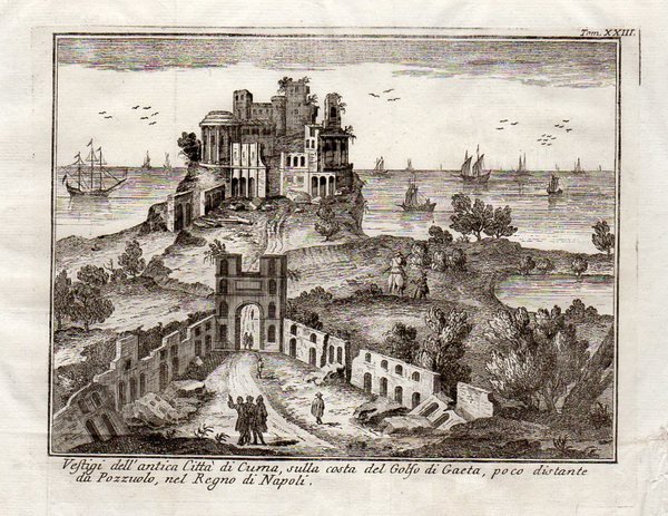 CUMA - "Vestigi dell'antica città di Cuma, sulla costa del Golfo di Gaeta, poco distante da Pozzuolo, nel Regno di Napoli." Bella veduta molto decorativa e animata da velieri, figure e rovine.