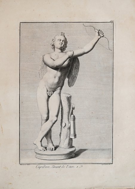 Opera tratta da Recueil des marbres antiques qui se trouvent dans la Galerie du Roy de Pologne à Dresden avec privilege du roy, l'année 1733, pubblicata da Raymond Leplat a Dresda nel 1735. Il catalogo raccoglie, in 230 tavole, la Galleria scultorea, antica e moderna, e altri oggetti artistici posseduti dall’elettore di Sassonia, Federico Augusto I detto Augusto il Forte, morto proprio nel 1733. Il re aveva acquistato arte antica da Federico Guglielmo I di Prussia (compresa la collezione dei ritratti romani di Bellori) e dalle famiglie Chigi e Albani di Roma (sculture, vasi, bronzi e mummie). Sebbene il frontespizio rechi la data del 1733, le tavole recano date anche successive. (1734-1735). Manca un apparato di commento che indichi le provenienze dei pezzi e la maggior parte delle tavole recano solo una breve denominazione dei soggetti, prevalentemente mitologici, raffigurati. Quasi tutte le tavole sono firmate dagli disegnatori e dagli incisori. I disegnatori sono A.M. Wernerin, J. Preissler, M. Tuscher e H. Preissler. Gli incisori L. Zucchi, C.F. Boetius, G. Mart. Preissler, Johann Balthasar Probst, Bernigeroth, Johann David Hertz, Iac. Gottlieb Thelot, Iac. Andr. Fridrich, Christian Philipp Lindemann, Hieronymus Sperling, “MB”, Joh. Jac. Steltzer o Chr. Raym. Thoman. Acquaforte, in ottimo stato di conservazione. Plate from Recueil des marbres antiques qui se trouvent dans la Galerie du Roy de Pologne à Dresden […], published in Dresden by Raymond Le Plat, in 1735. The collection of ancient and modern art at Dresden had been established by Friedrich August I (“Augustus the Strong”), who died in the same year as this book was published. He had bought antiquities from Frederick William I of Prussia (including the Bellori collection of Roman portraits) and from the Chigi and Albani families of Rome (including sculpture, vases, bronzes and mummies). Several Roman antiquities had arrived in Dresden as recently as 1729. The plates have no accompanying explanatory texts, but most are captioned. Subjects are chiefly mythological (the collection includes copies of some famous works, such as Praxiteles's “Satyr” and Scopas's “Maenad tearing a goat”). Almost all the plates are signed by draughtsmen and engravers. The draughtsmen were A.M. Wernerin, Joh. Justin Preissler, M. Tuscher or H. Preissler. The engravers were Lorenzo Zucchi, C.F. Boetius, Georg Mart. Preissler, Johann Balthasar Probst, Bernigeroth, Johann David Hertz, Iac. Gottlieb Thelot, Iac. Andr. Fridrich, Christian Philipp Lindemann, Hieronymus Sperling, “MB”, Joh. Jac. Steltzer or Chr. Raym. Thoman. Etching, in very good condition. Cfr.
