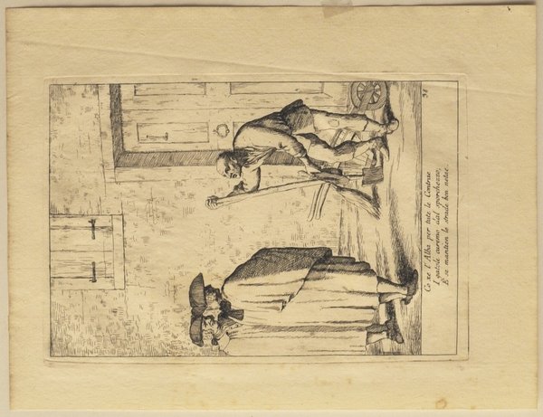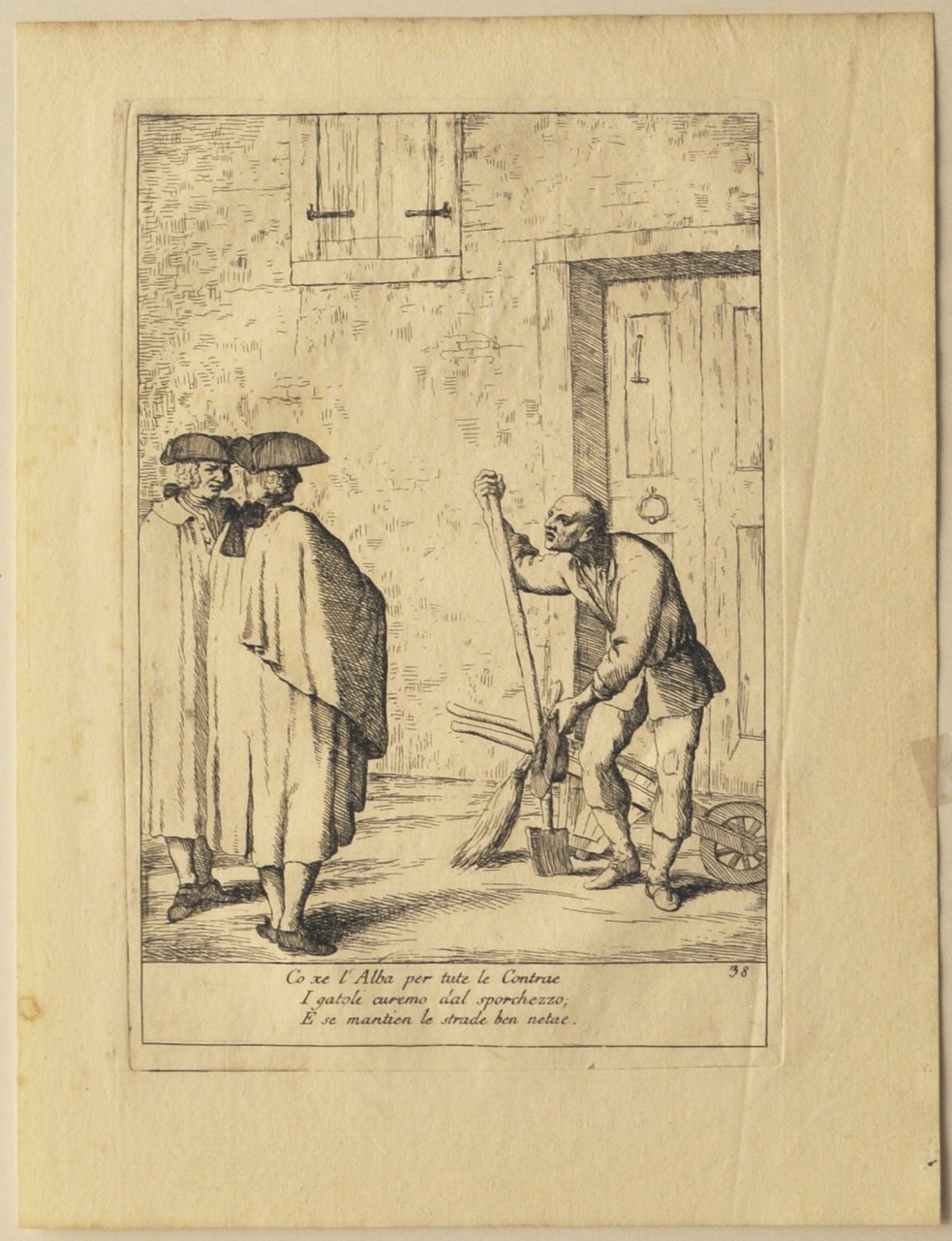 Acquaforte e bulino di mm 261 x 182. II/VI. Vergata veneziana tre lune, filigrana tre lune e scritta imperial.Bel foglio a pieni margini. Perfetta condizione."Col xe l'Alba per tute le Contrae I gatoli curemo dal sporchezzo; E se mantien le strade ben netae". A destra in basso numero 38. Proveniente da "Le Arti che vanno per via nella Città di Venezia inventate ed incise da Gaetano Zompini. Aggiuntavi una memoria di detto autore" Venezia 1785. Magnifica incisione in acquaforte e bulino della serie delle "Arti che van per via" di Zompini, stampata in una rarissima prima edizione coeva nel 1753, ed in questo secondo stato nel 1785 dal residente britannico John Strange. Venne ripubblicato in Inghilterra altre quattro volte. Da una lettera di John Strange si viene a sapere che la tiratura della presente edizione era di cento o duecento copie. Dario Succi "Da Carlevarijs a Tiepolo, Incisori veneti e friulani del settecento" pag. 454. Dalla "Memoria" di Gianmaria Sasso, premessa a questa edizione: "Gaetano Zompini nacque in Narvesa, nel Territorio Trivigiano, il 29 settembre 1698; ed inclinando da fanciullo alla Pittura, fu mandato a Venezia nella Scuola del Cavalier Bambini in que' tempi riputatissimo. Apprese dal suddetto oltre li principi del buon dissegno, anche in gran parte il suo modo di dipingere, ed uscito poi di detta Scuola si diede anche ad imitare la maniera di Sebastiano Ricci, allora dal medesimo introdotta ed assai stimata.Inventò pure e disegnò per il sig. Zatta, stampatore in Venezia buona parte delle Figure per le Edizioni del Dante e del Petrarca da lui stampata. Questo degno Pittore visse però quasi sempre povero, avendo numerosa Famiglia. Conoscendo per altro il di lui merito il fu Sig. Antonio Maria Zanetti, lo tirò appresso di sé, impiegandolo in vari lavori, ed in particolare in vari disegni, e lavorò in gran parte sopra alcuni rami tratti da' disegni di Gio. Benedetto Castiglione, posseduti dal detto Signore, e che avea già incominciato ad incidere; e per far la raccolta più numerosa, inventò, disegnò, ed incise egli stesso alcuni di detti Rami sul gusto affatto dell'Autore, e toccati con spirito. Non avendo poi esso Sig. Zanetti di che ordinargli di più, s'immaginarono di dare alle stampe una Raccolta delle Arti di Venezia, che vanno per via. Si accinse dunque lo Zompini al lavoro, ed inventò, disegnò, ed incise Rami num.60 rappresentanti l'Arti suddette, e sotto la direzione dello stesso sig. Zanetti, ed a imitazione poi delle Arti di Bologna similmente inventate ed incise dal celebre Annibale Carracci. A quest'opera fatta all'acqua forte, della quale alcune copie furono anche miniate, aggiunse sotto ogni rame alcuni versi il Dottor Questini Prete di Santa Maria Mater Domini, amico tanto dello Zompini, che del Zanetti. Pochi anni dopo mancò di vita il sig. Zanetti, il quale però per ilmerito dello Zompini, gli lasciò una picciola mensuale provigione sua vita durante. Dopo questa disgrazia ne successe allo Zompini un'altra peggiore, incominciandosi ad indebolire la vista; cosicchè alla fine la perdette affatto, e strascinandosi in tal modo fra le miserie e la vecchiaia, mancò di vivere il 20 Maggio 1778 nell'avanzata età di 76 anni.". Dal Succi (Da Carlevarijs ai Tiepolo): ".La prima edizione uscì in due tempi: nel 1753 fu pubblicata una parte comprendente quaranta stampe precedute da un frontespizio calcografico. Nello stesso anno, o più probabilmente, in quello successivo, vennero pubblicate le altre venti tavole.Le due parti vennero in seguito riunite in un unico volume in cui, dopo il frontespizio, compaiono i due indici. A dire del Sasso, alcune copie di questa prima edizione, oggi molto rara, sarebbero state miniate, cioè finemente colorate. Secondo Bozzolato (1978) la tiratura fu di 30-40 esemplari. La seconda edizione fu pubblicata postuma nel 1785 a cura di John Strange, residente britannico a Venezia dal 1773 al 1787, il quale aveva acquistato dagli eredi Zanetti i rami de Le Arti, tramite il proprio incaricato Gianmaria Sasso.I fogli presentano la filigrana delle tre mezze lunecon la scritta SOTO IMPERIAL o le lettere GFA e AV sormontate da una corona, oppure GB sormontate da un fiore. La tiratura di questa edizione fu di cento o di duecento copie. La terza edizione, stampata in Inghilterra dopo il 1787, è facilmente individuabile per la presenza, sotto ogni tavola . Traduzione in lingua inglese dei versetti veneziani di Guestini, oltre che per la presenza della filigrana LEPARD." Seguono una quarta, una quinta edizioni ottocentesche inglesi.