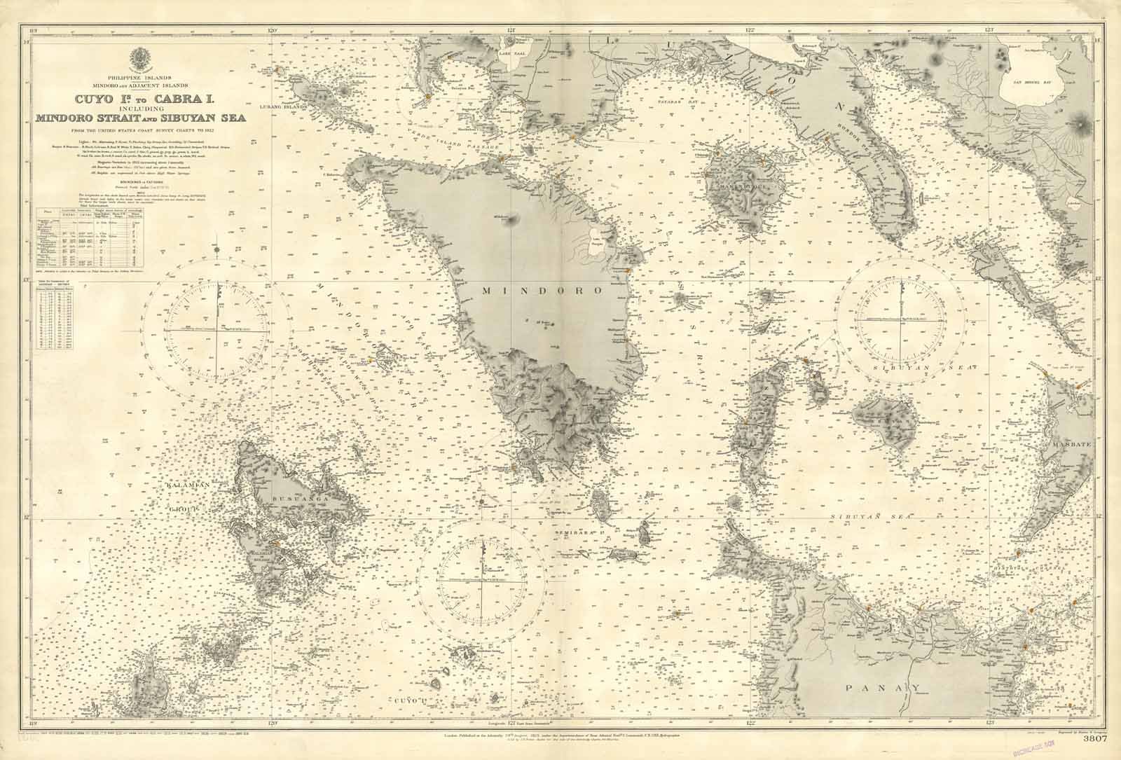 Carta nautica delle Filippine raffigurante in particolare la parte centrale dell'arcipelago. Troviamo rappresentate la parte meridionale dell'isola di Luzon e le isole di Marinduque, Mindoro, Burian, Masbate, Sibiyan, Tablas, il gruppo delle Semirara e quello delle Kalamian, per finire la parte settentrionale di Panay. La carta è tratta dalle carte dei rilievi do costa degli Stati Uniti del 1922. Piega editoriale. Il dominio statunitense ebbe inizio nel 1898 quando, in seguito alla vittoria nella Guerra ispano-americana, la Spagna si vide costretta a cedere Filippine, Cuba, Porto Rico e Guam agli Stati Uniti. During this period, the Philippines was under the colonial rule of the United States of America. American rule began in 1898 when, following its victory in the Spanish-American War, Spain was forced to cede the Philippines, Cuba, Puerto Rico, and Guam to the United States.