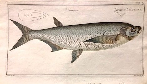 Incisione originale su rame (cm. 37x20,5 più ampi margini bianchi) di J.G. Schmidt tratta dalla celebre opera ‘Allgemeine Naturgeschichte der Fische’. Carta vergellata con filigrana. Splendida coloritura coeva all’acquarello. Ottimo esemplare.