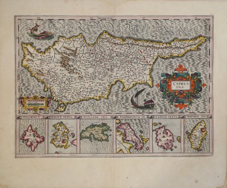 La carta di Cipro del Mercator, pubblicata da Jodocus Hondius nelle varie edizioni del Gerardi Mercatoris Atlas sive Cosmographicae Meditationes a partire dal 1606, fa parte delle 37 nuove mappe incise da Hondius per aggiornare l’opera cartografica del Mercator. La carta di Cipro sarà pubblicata poi in tutte le edizioni del grande atlante “Mercator/Hondius” fino al 1641. La mappa oltre ad una dettagliata raffigurazione di Cipro, contiene le carte delle isole di Stalimini, Chius, Mitelene, Negroponte, Cerigo e Rodi. Nel 1604, Jodocus Hondius (1563-1612) - probabilmente tramite Cornelis Claesz - acquistò le matrici in rame dell'Atlas sive cosmographicae meditationes de fabrica mundi di Gerard Mercator all’asta. Aggiunse circa 40 mappe, comprese nuove mappe dei continenti e importanti mappe regionali delle Americhe, prima di pubblicare una nuova edizione dell’opera, nel 1606, in concorrenza con il Theatrum Orbis Terrarum di Ortelius. Poiché molte delle mappe erano più aggiornate, la raccolta di Mercator & Hondius sostituì effettivamente il Theatrum di Ortelius. ' L’atlante del 1606 include tutte le 107 mappe dell’edizione del 1595, oltre a 37 nuove mappe, abilmente incise dallo stesso Hondius. La seconda edizione della raccolta seguì già nel 1607/08, mentre la prima edizione in un’altra lingua, il francese, fu messa sul mercato nel 1609. Apparentemente questa fu considerata come la terza edizione, perché nel 1611 apparve l'Editio Quarta, con un totale di 150 mappe. Dopo la morte di Jodocus Hondius (1612) la sua vedova e i suoi figli continuarono la stampa dell’atlante. Jodocus Junior ( o Jodocus II, 1594-1629) produsse diverse ristampe tra il 1613 e il 1619, sempre con le stesse 150 mappe; nel 1619 furono invece aggiunte sei nuove mappe. Dopo il 1620 la pubblicazione venne curata da Hendrick (Henricus) Hondius (1597-1651), il secondo figlio di Jodocus senior. Varie edizioni apparvero, nel 1623, 1628 e 1630. Hendrick fu il primo ad apportare dei veri cambiamenti: nell’edizione del 1628 firmò alcune mappe di Mercatore con il proprio nome. Nel 1630, quando probabilmente stava già collaborando con suo cognato Johannes Janssonius, aggiunse nove nuove carte. Incisione in rame, magnifica coloritura coeva, in eccellente stato di conservazione. Edizione latina. This map shows Cyprus, plus insets of six islands: Stalimini, Chius, Mitelene, Negroponte, Cerigo, and Rhodus. This map is from one of the great Hondius/Mercator atlases of the early 17th century. Jodocus Hondius (1563-1612) bought Mercator's map plates and added many of his own and also improved on Mercator's and Ortelius's maps. After his death, he was succeeded in the business by his sons and they issued many editions of their justly celebrated atlases between 1605 and 1641 with texts in several languages. This is from a latin edition. Copper engraving, magnificent contemporary color, in excellent condition. Cfr. A. & J. Stylianou, "The History of the Cartography of Cyprus", pp. 82-83, 98; L. Navari, "Maps of Cyprus", p. 139, 51; Zacharakis C. G. "A Catalogue of Printed Maps of Greece 1477 - 1800" (2009), n. 2211; Sweet Land of Cyprus, n. 45