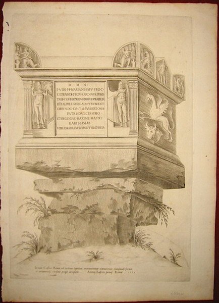 Incisione originale su rame (cm. 30,5x44,7 più margini bianchi). Carta vergellata con filigrana. Due forellini di tarlo sul margine bianco sinistro, altrimenti esemplare in ottimo stato di conservazione. Imprint sulla lastra in basso: ‘Antonij Lafrerij formis Romae 1551’. Unico stato conosciuto. Arrigoni-Bertarelli, n. 3093; Rubach, n. 304. Veduta del Sepolcro di Publio Vibio Mariano - proconsole della Sardegna e prefetto vissuto nella prima metà del III Secolo d.C. - e della di lui moglie Regina Maxima. Situato sulla via Cassia fu erroneamente ritenuto nel Medioevo la Tomba di Nerone. Antoine Lafrery (Antonio Lafreri nella forma italianizzata), incisore, editore e mercante di stampe curò la pubblicazione tra il 1544 ed il 1575 di una serie di circa 200 incisioni - raffiguranti perlopiù monumenti ed antichità romane ed opera di diversi autori - nota come ‘Speculum Romanae Magnificentiae’. Le stampe erano poste in vendita sia singolarmente che sotto forma di raccolta con un numero spesso variabile di fogli. Dal 1574 iniziò a circolare anche una tavola-frontespizio dello ‘Speculum’, attribuita a Etienne Duperac. Successivamente, tra il tardo Cinquecento ed il Settecento, i rami lafreriani conobbero tirature posteriori con l’imprint di vari editori ed il contributo di diversi incisori. Inoltre lo ‘Speculum’ fu ampliato nel tempo mediante l’aggiunta di altre tavole il cui minimo comune denominatore appare quello di riprodurre opere antiche e moderne di Roma.