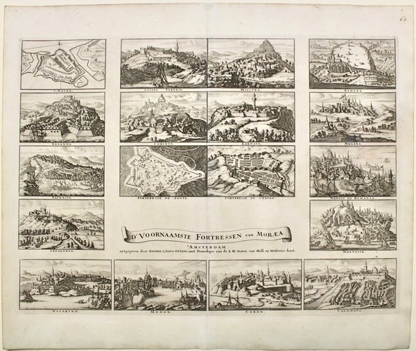 Incisione in rame, mm 430x600; Stampa di notevole rarità nel secondo stato di due con la nota editoriale di Ottens. La tavola riporta 18 vedute di fortezze del Peloponneso in riquadri di circa mm 80x140; a partire in alto a sinistra: S. maura, Castel Tornese, Athene, Lepanto, Corinto, Zarnata, Megara, Patrasso, Zante, Cerigo, Napoli di Romania, Cefalonia, Malvasia, Navarino, Modone, Coroni, Calamata. Il titolo è su nastro al centro. Splendido esemplare perfettamente conservato ed a pieni margini. <BR><BR>