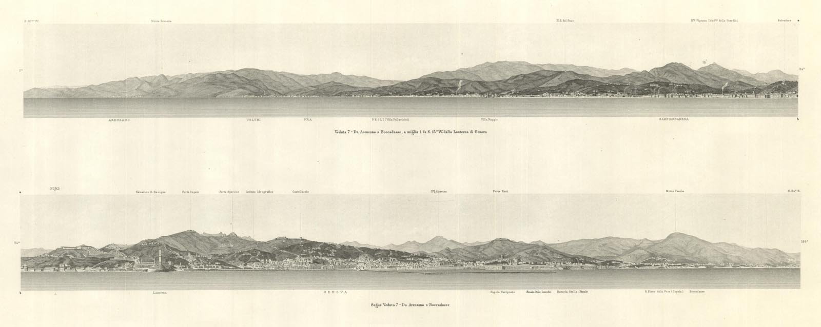 Stampa antica originale raffigurante il tratto di costa ligure compreso tra Arenzano e Boccadasse. La prima veduta riguarda il tratto tra Arenzano e Sampierdarena e nello specifico Voltri, Pra, Pegli con Villa Pallavicini e Villa Raggio; mentre la seconda riprende il tratto di Genova tra la Lanterna e Boccadasse. L'incisione fa parte della raccolta di vedute di costa dal titolo "Riviera Ligure dal Golfo della Spezia a Monaco" realizzate da Alberto Porro, che viene ricordato dal Paganini per "la facilità ed il colpo d'occhio nel disegnare con prontezza ed esattezza sufficiente una veduta in tutti i suoi particolari" (1896, p. 36). I lavori di rilevamento delle coste vengono fatti risalire al 1887 (Presciuttini) e per una serie di eventi pubblicate dall'Istituto solo nel 1904 sotto la direzione del Capitano di Vascello Pasquale Leonardi-Cattolica. Lieve piega, stato di conservazione molto buono.