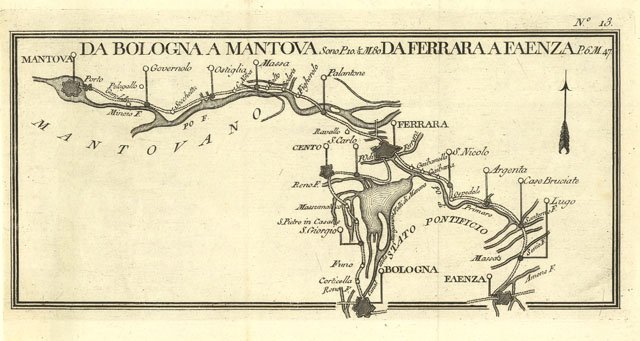 Itinerario raffigurante il percorso stradale con evidenziati castelli, città e stazioni postali tra cui Ostiglia, Ferrara, Cento, Bologna, Argenta, Lugo. Pieghe editoriali