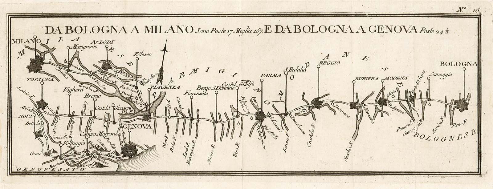 Itinerario raffigurante il percorso stradale con evidenziati castelli, città e stazioni postali tra cui Modena, Reggio Emilia, Parma, Fiorenzuola, Piacenza Lodi , Novi Ligure, Tortona, Voghera. Pieghe editoriali
