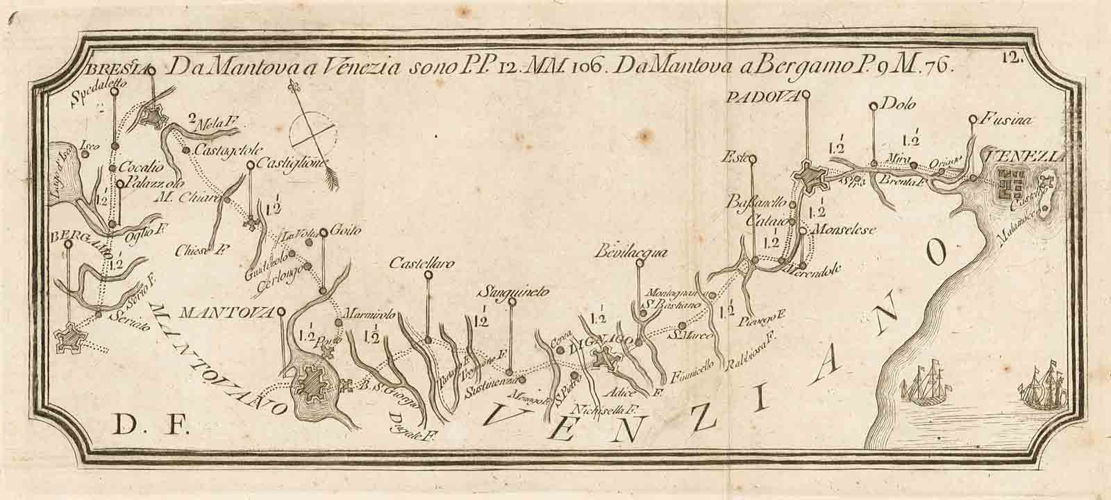 Da Mantova a Venezia sono P.P. 12 MM 106. Da Mantova a Bergamo P.9 M.76