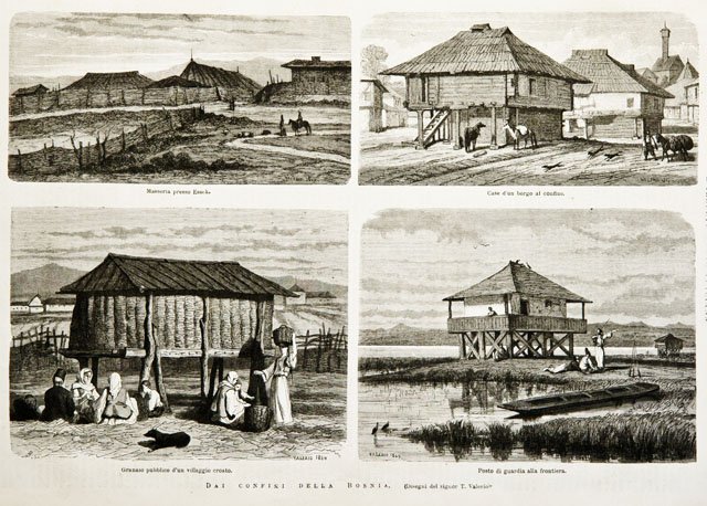 Dai confini della Bosnia / Masseria presso Essek.- Case d’un borgo al confine.- Granaio pubblico d’un villaggio croato.- Posto di guardia all frontiera