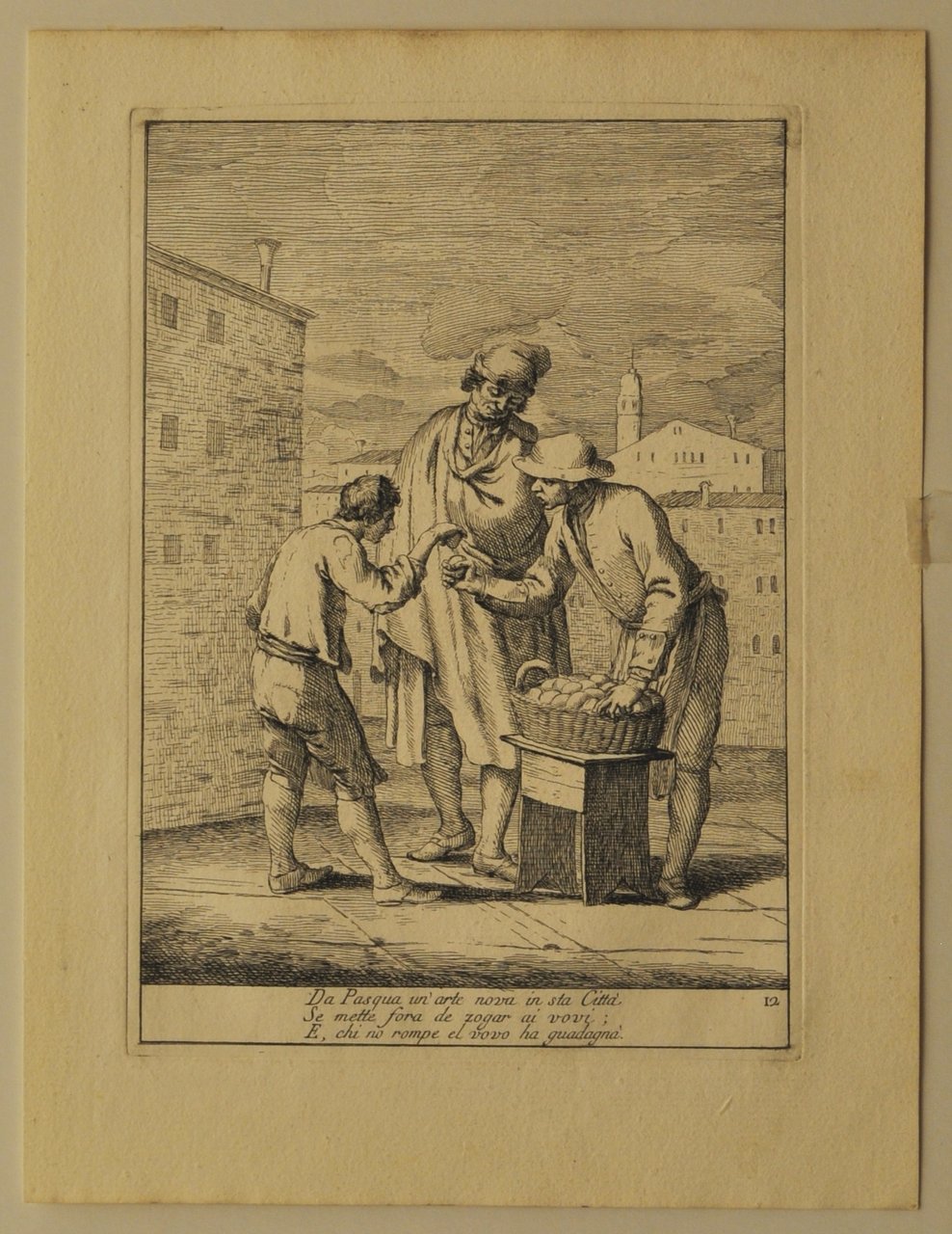 Acquaforte e bulino di mm 261 x 182. II/VI. Vergata veneziana tre lune, filigrana tre lune e scritta imperial. Bel foglio a pieni margini. Perfetta condizione. "Da Pasqua un'arte nova in sta Città Se mette fora de zogar ai vovi; E, chi no rompe el vovo ha guadagnà". A destra in basso numero 12. Proveniente da "Le Arti che vanno per via nella Città di Venezia inventate ed incise da Gaetano Zompini. Aggiuntavi una memoria di detto autore" Venezia 1785. Magnifica incisione in acquaforte e bulino della serie delle "Arti che van per via" di Zompini, stampata in una rarissima prima edizione coeva nel 1753, ed in questo secondo stato nel 1785 dal residente britannico John Strange. Venne ripubblicato in Inghilterra altre quattro volte. Da una lettera di John Strange si viene a sapere che la tiratura della presente edizione era di cento o duecento copie. Dario Succi "Da Carlevarijs a Tiepolo, Incisori veneti e friulani del settecento" pag. 454. "Gaetano Zompini nacque in Narvesa, nel Territorio Trivigiano, il 29 settembre 1698; ed inclinando da fanciullo alla Pittura, fu mandato a Venezia nella Scuola del Cavalier Bambini in que' tempi riputatissimo. Apprese dal suddetto oltre li principi del buon dissegno, anche in gran parte il suo modo di dipingere, ed uscito poi di detta Scuola si diede anche ad imitare la aniera di Sebastiano Ricci, allora dal medesimo introdotta ed assai stimata.Inventò pure e disegnò per il sig. Zatta, stampatore in Venezia, buona parte delle Figure per le Edizioni del Dante e del Petrarca da lui stampata. Questo degno Pittore visse però quasi sempre povero, avendo numerosa Famiglia. Conoscendo per altro il di lui merito il fu Sig. Antonio Maria Zanetti, lo tirò appresso di sé, impiegandolo in vari lavori, ed in particolare in vari disegni, e lavorò in gran parte sopra alcuni rami tratti da' disegni di Gio. Benedetto Castiglione, posseduti dal detto Signore, e che avea già incominciato ad incidere; e per far la raccolta più numerosa, inventò, disegnò, ed incise egli stesso alcuni di detti Rami sul gusto affatto dell'Autore, e toccati con spirito. Non avendo poi esso Sig. Zanetti di che ordinargli di più, s'immaginarono di dare alle stampe una Raccolta delle Arti di Venezia, che vanno per via. Si accinse dunque lo Zompini al lavoro, ed inventò, disegnò, ed incise Rami num.60 rappresentanti l'Arti suddette, e sotto la direzione dello stesso sig. Zanetti, ed a imitazione poi delle Arti di Bologna similmente inventate ed incise dal celebre Annibale Carracci. A quest'opera fatta all'acqua forte, della quale alcune copie furono anche miniate, aggiunse sotto ogni rame alcuni versi il Dottor Questini Prete di Santa Maria Mater Domini, amico tanto dello Zompini, che del Zanetti. Pochi anni dopo mancò di vita il sig. Zanetti, il quale però per ilmerito dello Zompini, gli lasciò una picciola mensuale provigione sua vita durante. Dopo questa disgrazia ne successe allo Zompini un'altra peggiore, incominciandosi ad indebolire la vista; cosicchè alla fine la perdette affatto, e strascinandosi in tal modo fra le miserie e la vecchiaia, mancò di vivere il 20 Maggio 1778 nell'avanzata età di 76 anni."