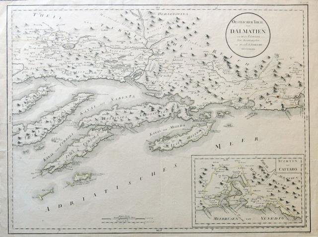 1789. Incisione in rame, confini in colore d’epoca, cm 47 x 62 (alla lastra). Carta della Dalmazia con le sue coste; in un piccolo riquadro, in basso a ds., è segnalato il golfo di Venezia che tocca la costa dalmata del Montenegro con le sue Bocche di Càttaro (una serie di insenature costituite da ampi valloni fra loro collegati che si inseriscono profondamente nell’entroterra). Buona conservazione.