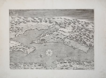 Rarissima carta della Dalmazia centrale di Martino Rota, nella ristampa seicentesca curata da Stefano Mozzi Scolari, conosciuta sinora solo per l’esemplare della collezione Novacco. Carta senza titolo. In basso a destra troviamo la firma: Martinus Rotta. In basso al centro, nel mare, è disegnata la MESURA DELLE MIGLA, una scala grafica priva di indicazioni, costituita da 3 e 6 unità di miglia, pari a mm 52. Orientazione con una rosa a otto venti nel mare, il nord è in alto. Priva di graduazione ai margini. Esemplare nel terzo stato di tre descritto in Bifolco-Ronca; viene abrasa la firma del Doino, sostituita dall’imprint Stefano Scolari formis in Venetia. Acquaforte e bulino, circa 1570, firmata in lastra in basso al centro-destra. Magnifica prova, impressa su carta vergata coeva, con margini, in eccellente stato di conservazione. “Carta prospettica, priva di data, della Dalmazia centrale che descrive la regione di Split (it. Spalato) qui nella forma italianizzata Spalato. Si tratta di un’innovativa ed importante rappresentazione, in alzato prospettico, che ebbe repliche anche nel secolo successivo. Si estende sulla costa dalla città di Trogir fino ad Omi (Almisa) ed è firmata dal sebenicense Martino Rota. Per analogia con le altre opere del Rota, la carta è databile al 1570 circa. Meurer stabilisce come terminus ante quem della lastra il 1568, quando Martino Rota si trasferisce alla corte imperiale viennese, ma poi si corregge, sostenendo che la collaborazione tra l’incisore e gli editori veneti sia da collocare ben oltre questa data. Secondo Mliinari? la carta – che descrive come datata in lastra - sarebbe stata stampata da Camocio tra il 1558 ed il 1568, ma la teoria ci sembra molto debole, in assenza di elementi che possano corroborarla. L’opera, scarsamente diffusa nelle raccolte cinquecentesche, ebbe due tirature successive per mano degli editori Catarin Doino e Stefano Scolari. Il secondo stato della lastra, a firma Doino, è databile al 1620 circa. Viene descritto da Shirley per l’esemplare conservato nella raccolta fattizia della British Library [Maps C.7. e 3.(1)]. Altri esemplari censiti sono quelli alla Newberry Library e alla Bibliothèque Nationale. Una terza stesura della lastra viene stampata da Stefano Scolari verso la metà del XVII secolo. Illustrata nel catalogo della collezione Novacco, viene descritta già da Almagià”. (cfr. S. Bifolco – F. Ronca, Cartografia e topografia italiana del XVI secolo (2018), p. 1370. Martino Rota (Sebenico 1520 – Venezia 1583) era un incisore e editore di Sebenico, attivo a Venezia, Vienna e Praga. La prima opera datata risale al 1558. Probabilmente lavorò a Venezia fino al 1572. Lastre del 1571/2, con soggetti relativi alla vittoria sui Turchi, a Lepanto, sembra siano state realizzate a Venezia. A Vienna, realizzò ritratti tra il 1573 e il 1576, accreditato alla corte di Massimiliano II. Si trasferì a Praga nel 1580. A Venezia le sue lastre vennero pubblicate da Luca Guarinoni, Luca e Ferrando Bertelli, Giovanni Francesco Camocio, Giovanni Mastini, Benedetto Stefani, Claudio Duchetti, Nicolò Nelli e Bolognino Zaltieri. Stefano Mozzi Scolari era un disegnatore, incisore e editore bresciano, attivo a Venezia dal 1644 al 1687. La sua bottega era una delle migliori calcografie veneziane del ‘600. Esercitò l’arte delle stampe e del commercio di carte geografiche a S. Zulian all’insegna delle Tre Virtù. Si servì dei rami di Bertelli, Valegio e Van Aelst. Curò anche le ristampe di importantissime carte quali la Lombardia del Gastaldi, e le carte dell’Italia di Greuter e Magini. Magnifico esemplare, appartenuto alla collezione di Fritz Hellwig. Bibliografia S. Bifolco – F. Ronca, Cartografia e topografia italiana del XVI secolo (2018): pp. 1370-1371, tav. 625, III/III; Almagià (1929): p. 40, n. 1; Borroni Salvadori (1980): n. 205; Cartografia Rara (1986): n. 39; Meurer (2002): n. 50; Mliinari? (2011): pp. 77-78, tav. 3. A very rare map of central Dalmatia by Martino Rota, in the seventeenth-century reprint edited by Stefano Mozzi Scolari, known so far only from the example in the Novacco collection. Untitled map. In the lower right corner we find the signature: Martinus Rotta. Bottom center, in the sea, is drawn the MESURA DELLE MIGLA, a graphic scale without indications, consisting of 3 and 6 units of miles, equal to mm 52. Orientation with an eight-wind rose in the sea, north is at the top. Devoid of graduation in the margins. Exampelin the third state of three described in Bifolco-Ronca; Doino's signature is abraded, replaced by the imprint Stefano Scolari formis in Venetia. Etching and engraving, circa 1570, signed in plate lower center-right. Magnificent proof, impressed on coeval laid paper, with margins, in excellent condition. “Carta prospettica, priva di data, della Dalmazia centrale che descrive la regione di Split (it. Spalato) qui nella forma italianizzata Spalato. Si tratta di un’innovativa ed importante rappresentazione, in alzato prospettico, che ebbe repliche anche nel secolo successivo. Si estende sulla costa dalla città di Trogir fino ad Omi (Almisa) ed è firmata dal sebenicense Martino Rota. Per analogia con le altre opere del Rota, la carta è databile al 1570 circa. Meurer stabilisce come terminus ante quem della lastra il 1568, quando Martino Rota si trasferisce alla corte imperiale viennese, ma poi si corregge, sostenendo che la collaborazione tra l’incisore e gli editori veneti sia da collocare ben oltre questa data. Secondo Mliinari? la carta – che descrive come datata in lastra - sarebbe stata stampata da Camocio tra il 1558 ed il 1568, ma la teoria ci sembra molto debole, in assenza di elementi che possano corroborarla. L’opera, scarsamente diffusa nelle raccolte cinquecentesche, ebbe due tirature successive per mano degli editori Catarin Doino e Stefano Scolari. Il secondo stato della lastra, a firma Doino, è databile al 1620 circa. Viene descritto da Shir