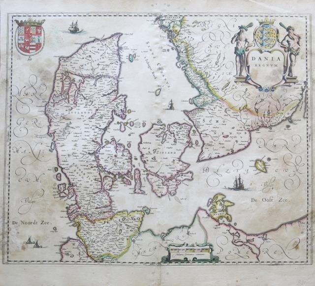 Amsterdam, 1640 circa. Incisione in rame all'acquaforte, colore d'epoca, cm 43,2x 53,7 (alla lastra) più margini, testo francese al verso. Dettagliata carta della Danimarca con parte della Germania e della Svezia. Tracce e aloni di umido, discreto l'inciso.