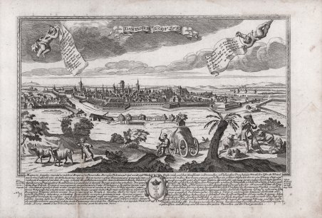 Bella e rara veduta panoramica della città delineata sulla scia della più grandi vedute disegnate da Fredrich Bernhard Werner e pubblicata ad Augsburg dagli eredi dell’editore Jeremias Wolff (1663-1724), Georg Balthasar Probst (1673-1750) – suo genero – e il suo successore, il figlio Johann Friedrich (1719-1781). Werner, nato a Reichenau, fu disegnatore, incisore, ingegnere e scenografo; durante la sua intensa vita viaggiò a lungo in vari stati europei prima in qualità di soldato poi come semplice viaggiatore, realizzando numerosi disegni dei luoghi visitati. Dopo aver trascorso un periodo di studio ad Augsburg collaborando con l’incisore K. Remshard, nel 1730 egli intraprese un viaggio in Italia, visitando molte città della penisola, per poi diventare ingegnere e scenografo del re di Prussia. La sua vasta produzione comprende una molteplicità di lavori dedicati a luoghi e città di vari paesi europei – Polonia, Olanda, Francia, Italia – soffermandosi in particolare sulla sua patria, alla quale sono dedicate le immagini della “Scenografia urbium Silesiae”, edita dagli eredi di Johann Baptist Homann a Norimberga. Werner può essere considerato uno dei più prolifici disegnatori della sua generazione, uno degli ultimi grandi personaggi che nel corso del Settecento si dedicano alla realizzazione del ritratto di città rappresentando la struttura urbana nella sua interezza, nel solco di una tradizione ormai secolare; nel corso del secolo le logiche che si affermeranno saranno invece da un lato quelle che frantumeranno la città in più immagini, dall’altro quelle che porteranno alla definitiva affermazione della topografia scientifica. Le immagini del Werner costituiscono un modello per la realizzazione di alcune altre vedute edite in Europa. Tra queste vanno ricordate quella dell’editore viennese Christofer Haffner (1668-1754), attivo probabilmente tra il 1720 e il 1750, e quelle di Johann Christian Leopold (1699-1755). Il Leopold, era un modesto incisore ed editore di Augsburg; la sua serie di vedute di città, da cui questa incisione è tratta, venne pubblicata con pochissima tiratura, rendendo quindi le opere particolarmente rare. Incisione in rame, in ottimo stato di conservazione. Beautiful and rare panoramic view of the city sketched in the wake of the greatest views drawn by Fredrich Bernhard Werner and published in Augsburg by the heirs of publisher Jeremias Wolff (1663-1724), Georg Balthasar Probst (1673-1750) - his son-in-law- and his successor, his son Johann Friedrich (1719-1781). Werner, born in Reichenau, was a draughtsman, engraver, engineer and stage designer; during his busy life he traveled extensively in various European states first as a soldier then as a simple traveler, producing numerous drawings of the places he visited. After spending a period of study in Augsburg working with engraver K. Remshard, he undertook a trip to Italy in 1730, visiting many cities on the peninsula, later becoming engineer and set designer to the King of Prussia. His vast output includes a multiplicity of works devoted to places and cities in various European countries - Poland, Holland, France, Italy - dwelling particularly on his homeland, to which the images of the "Scenografia urbium Silesiae", published by the heirs of Johann Baptist Homann in Nuremberg, are dedicated. Werner can be considered one of the most prolific draughtsmen of his generation, one of the last great figures during the eighteenth century to devote himself to the creation of the city portrait by depicting the urban structure in its entirety, in the wake of a tradition that was now centuries old; in the course of the century, the logics that would assert themselves would instead be, on the one hand, those that would break the city into several images, and on the other, those that would lead to the definitive establishment of scientific topography. Werner's images provide a model for the creation of a number of other views published in Europe. These include those of the Viennese publisher Christofer Haffner (1668-1754), active probably between 1720 and 1750, and those of Johann Christian Leopold (1699-1755). Leopold, was a modest Augsburg engraver and publisher; his series of city views, from which this engraving is taken, was published with very few print runs, thus making the works particularly rare. Copperplate engraving, in very good condition. Cfr.