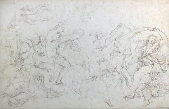 Senza titolo (Danza di uomini e donne). Da un disegno di Giulio Romano (“Iulius Romanus del.” nel figurato in bs. a sn.) incisione in delineato di A. Bartsch (“A. Bartsch sc. 1803 Sept.” ), a china marrone. Il tratto deciso e fortemente dinamico conferisce ulteriore dinamicità alla scena in movimento. Rifilato in prossimità del quadro di filettatura, alcuni lievi punti di ossidazione, peraltro in buono stato di conservazione.