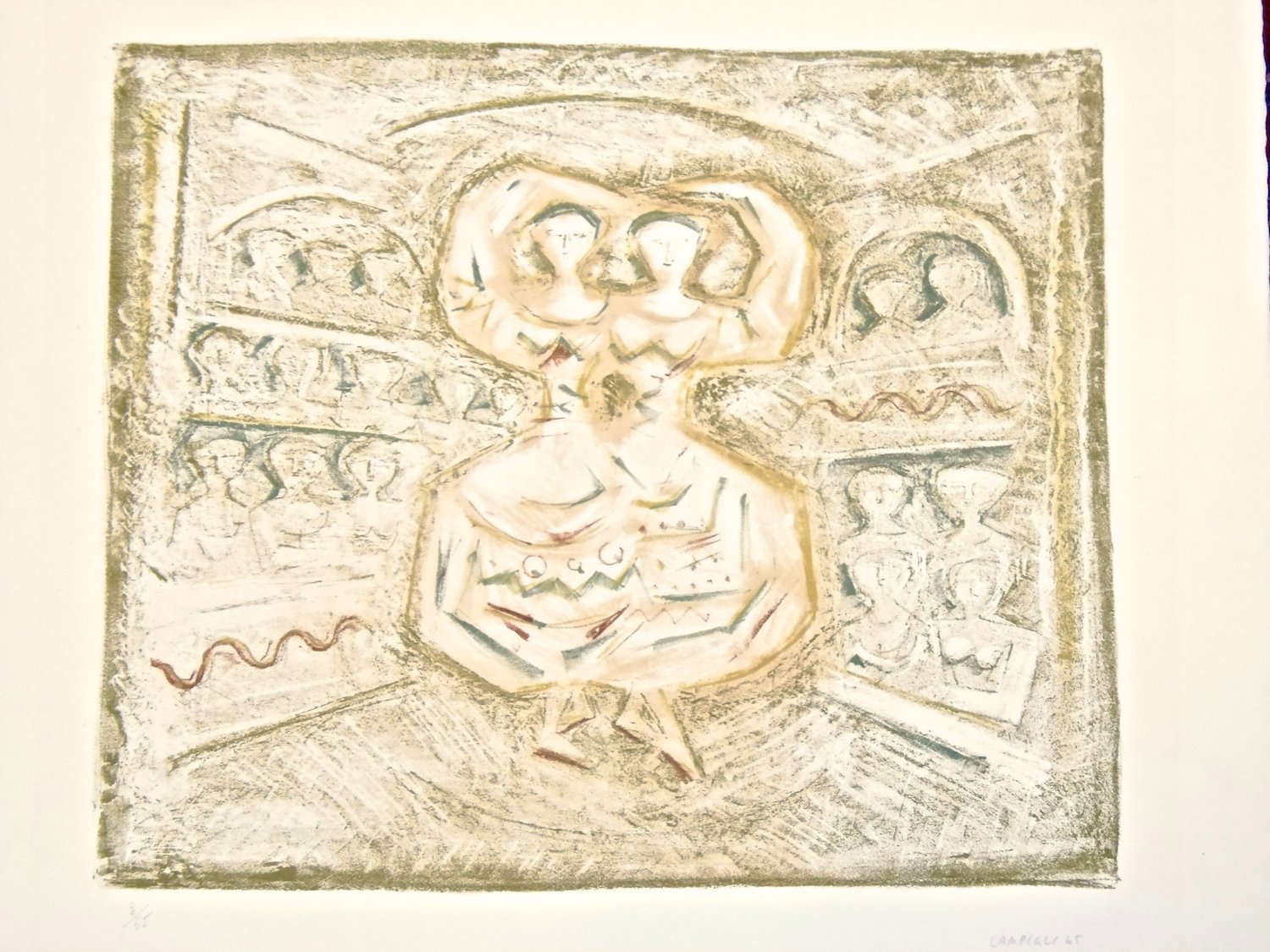 Litografia a colori eseguita nel 1965, mm 415x495 (foglio mm 500x655). Tiratura su carta "Rives". Firmata "Campigli 65" in basso a destra e numerata 3/65 tutto a lapis. Timbretto a secco "K", editore Ketterer per la cartella "Europaeische Graphik III" pubblicata a Monaco di Baviera. <BR>Ottima prova, stato unico, pieni margini. Ottimo stato di conservazione.<BR>Le maggiori fonti d'ispirazione dell'artista furono l'arte etrusca e l'archeologia, ma la figura della madre, il ruolo e l'importanza che le donne rivestirono nella sua vita furono di straordinario rilievo per la sua arte. Rappresenta sovente una donna grande sia dal punto di vista figurativo, poiché riempie la tela, che spirituale per la benevolenza e la confortante presenza. L'immagine che l'artista ci regala è quella ricorrente della figura femminile vista come un essere eccezionale, ma allo stesso tempo un essere umano dalla grande semplicità, una donna che riempie il mondo e viene raffigurata nei diversi momenti della propria vita. Meloni 212. <BR>