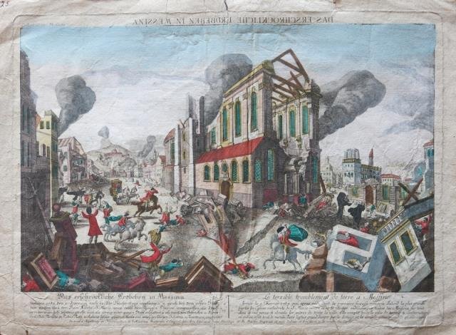 Augsbourg, 1785. Incisione in rame all’acquaforte, colore d’epoca, cm 30 x 41 (alla lastra). Titolo tedesco in alto (riportato al contrario trattandosi di veduta ottica); doppio titolo, tedesco e francese in basso, con rispettiva sottostante didascalia in lingua. Curiosa e drammatica veduta raffigurante il devastante terremoto di Messina avvenuto nel 1783. L'evento, che fu la più grande catastrofe che colpì l'Italia meridionale nel XVIII secolo, fu anche denominato "Terremoto di Reggio e Messina del 1783" dato che colpì lo Stretto di Messina e la Calabria meridionale. Gualciture e pieghe della carta, bello l'inciso e la coloritura coeva. .