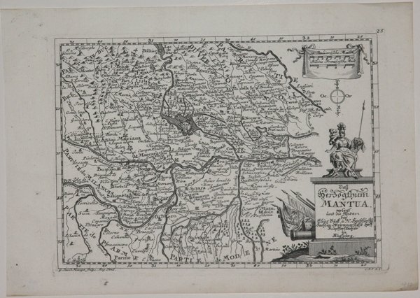 Rara carta geografica del territorio di Mantova, pubblicata ad Ausburg da Elias Baeck. "Questo esemplare è un rifacimento sommario di materiale derivante dalla carta maginiana; di modesto livello tecnico, prsenta varie storpiature toponomastiche ed approssimazioni esecutive, come la rappresentazione della città abbozzata in pianta o la distribuzione dei rilievi orografici" (cfr. Ferrari, p. 159).Incisione in rame, in perfette condizoni. Rare map published in Augsburg by Elias Baeck. Copper engraving, very good conditions. Cfr. Ferrari, "Mantova nelle Stampe", p. 159, 339.