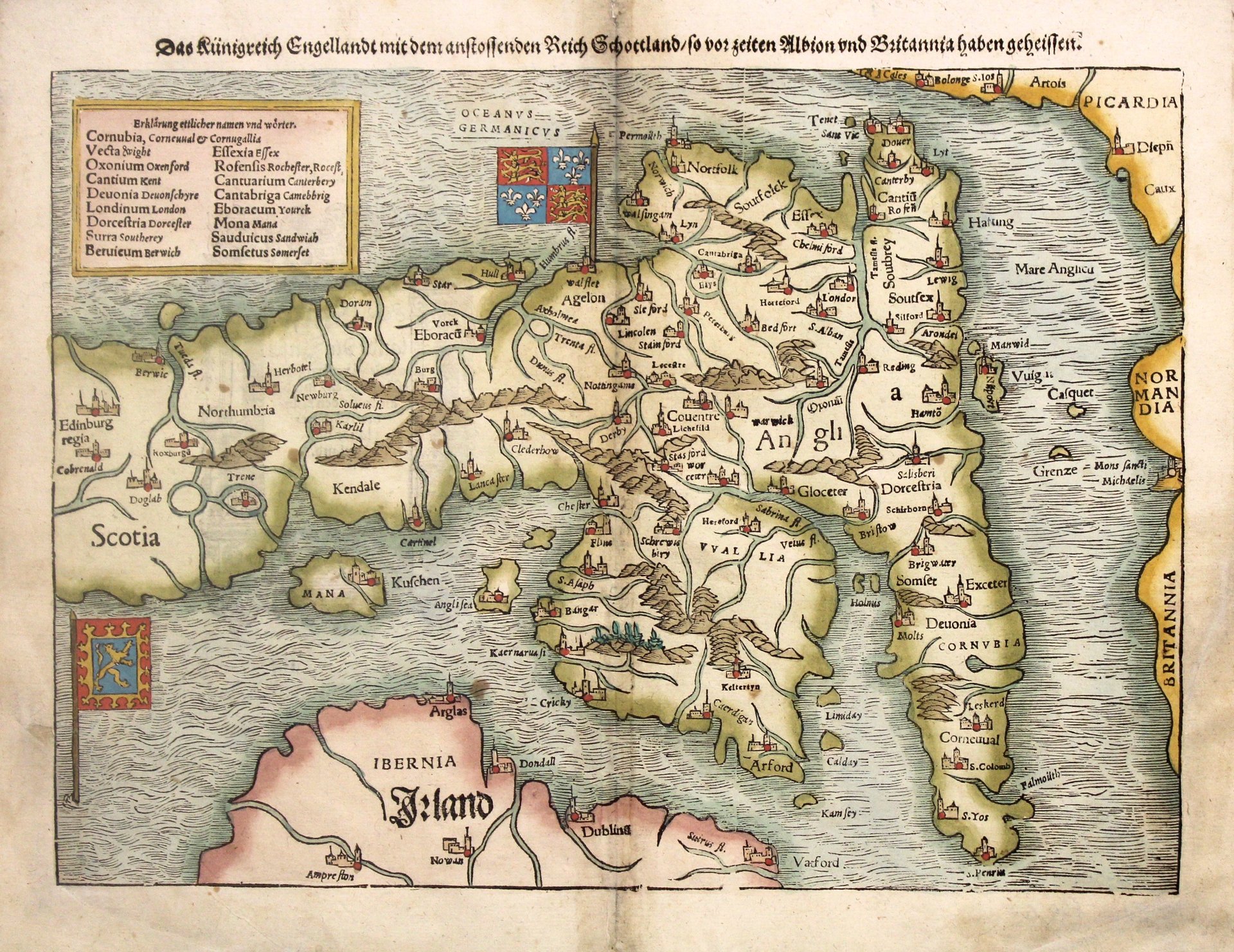 Silografia, dipinta a mano, mm 252x346 raffigurante una fascinosa carta geografica di Inghilterra e parte della Scozia. L'incisione è tratta dalla versione tedesca di "Cosmographia universalis", una delle prime descrizioni del mondo intero e la più importante opera geografica tedesca dopo la Cronaca di Norimberga del 1493. Buon esemplare con alcune tracce di sporco superficiale, piccolo difetti marginali ed un restauro al titolo in alto al centro.<BR>Woodcut, colored, mm 252x346, showing England and part of Scotland. Some defects in margins, surface dirt and a restored tear affecting title at top.<BR>From a german edition of "Cosmographia universalis" one of the most important geographical description of the XVI century after the Nuremberg Chronicle. Printed for the first time in 1544 by Heinrich Petri, has been updated and increased for several times with new geographic maps and views of cities, it had numerous editions in different languages: latin, italian, french, english and czech. It passed trough 24 editions in about 80 years. This success was due to the notable woodcuts, some by Hans Holbein the younger, Urs Graf, Hans Rudolph Deutsch, and David Kandel.