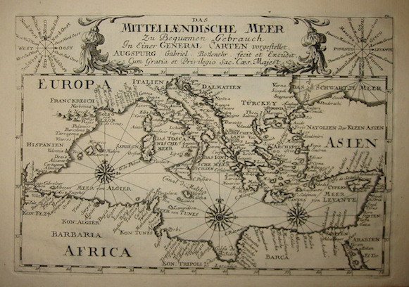 Carta geografica originale (cm. 23x16 più ampi margini bianchi) tratta da ‘Curioses Staats und Kriegs Theatrum.’. Esemplare in perfetto stato di conservazione.