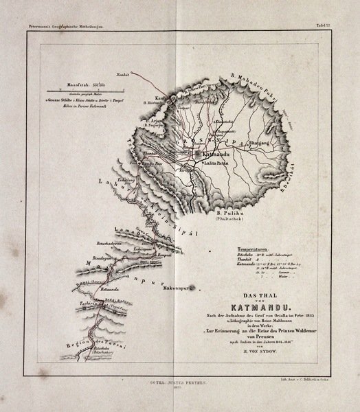 Litografia, mm 175x200. Pubblicata da Justus Perthes e stampata da Bellfahrt. Raffigura la valle di katmandu e dintorni. Buone condizioni, piccole macchie, pieghe editoriali. <BR>