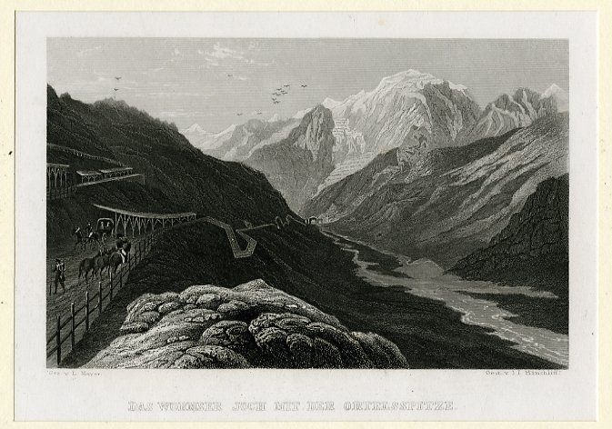 Incisione su acciaio di dimensioni 95x150 mm. Condizioni : USATO - Stato : Buono, ordinari segni d'uso e del tempo. Altre note : Veduta ottocentesca del Giogo di Santa Maria o Passo dell'Umbrail (Wormserjoch in tedesco), valico situato nelle Alpi Retiche occidentali non lontano dal passo dello Stelvio. Sullo sfondo il massiccio dell'Ortles.